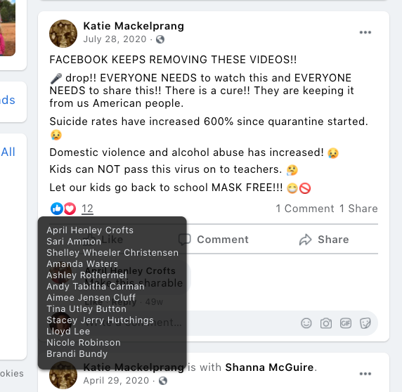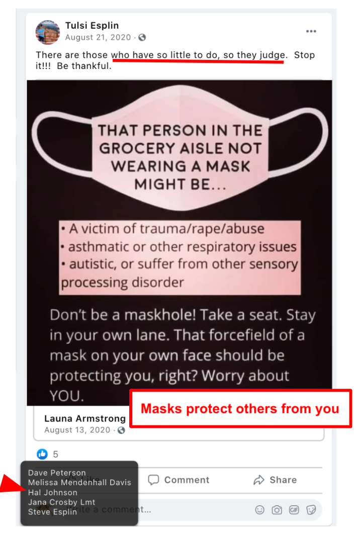- encouraged mask misinformation and ridiculing proponents by Tulsi Esplin (added 07/18)