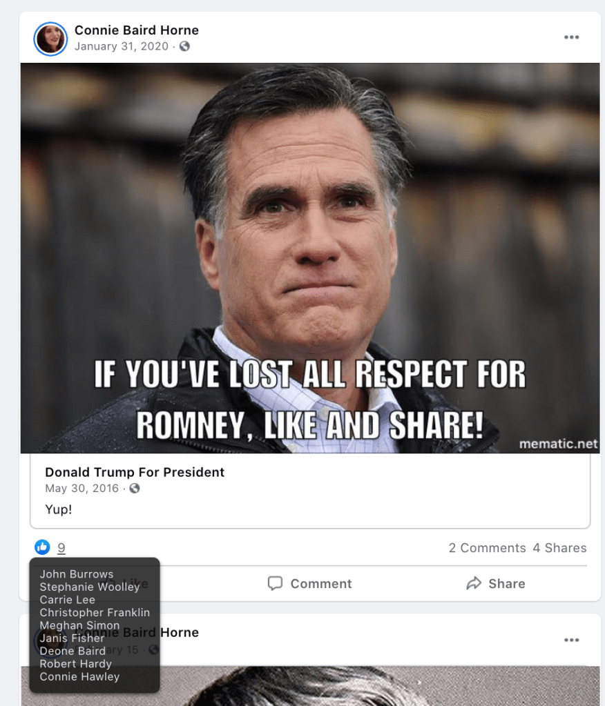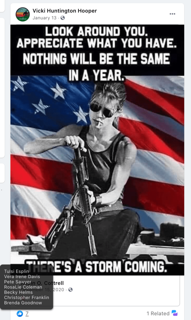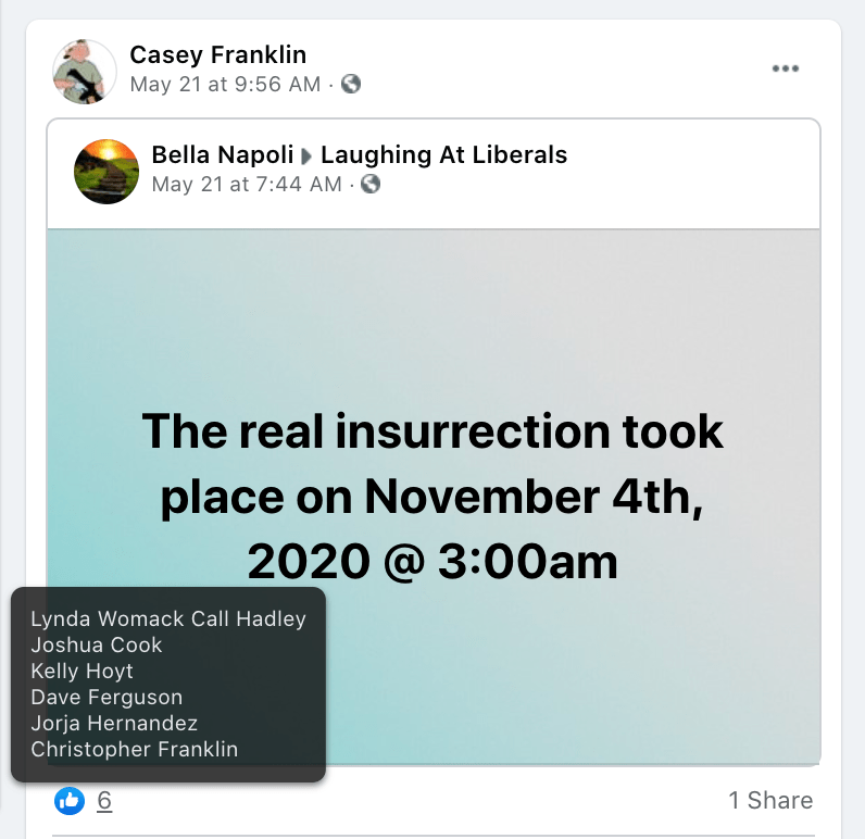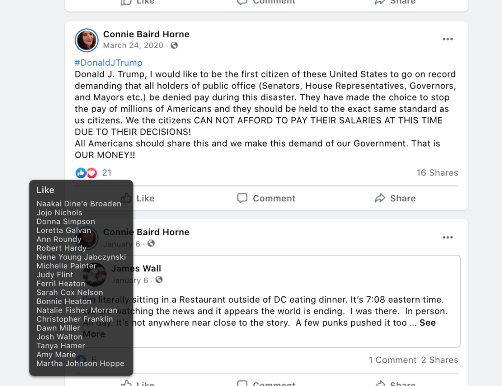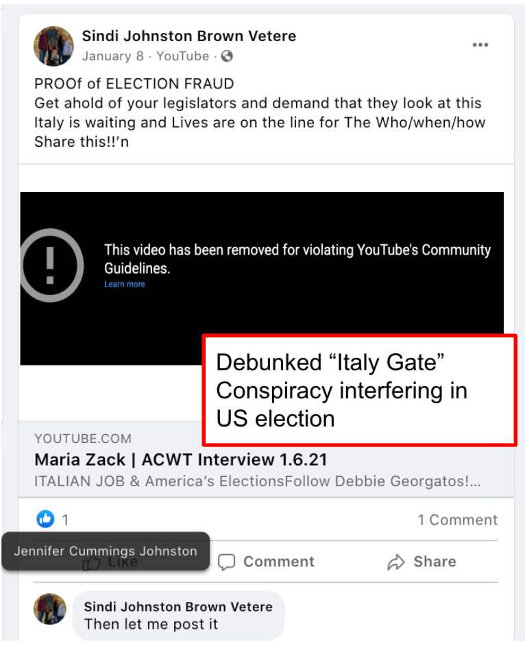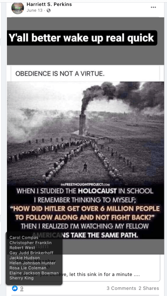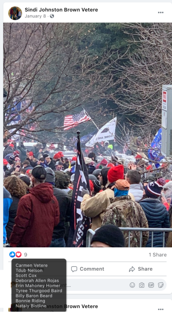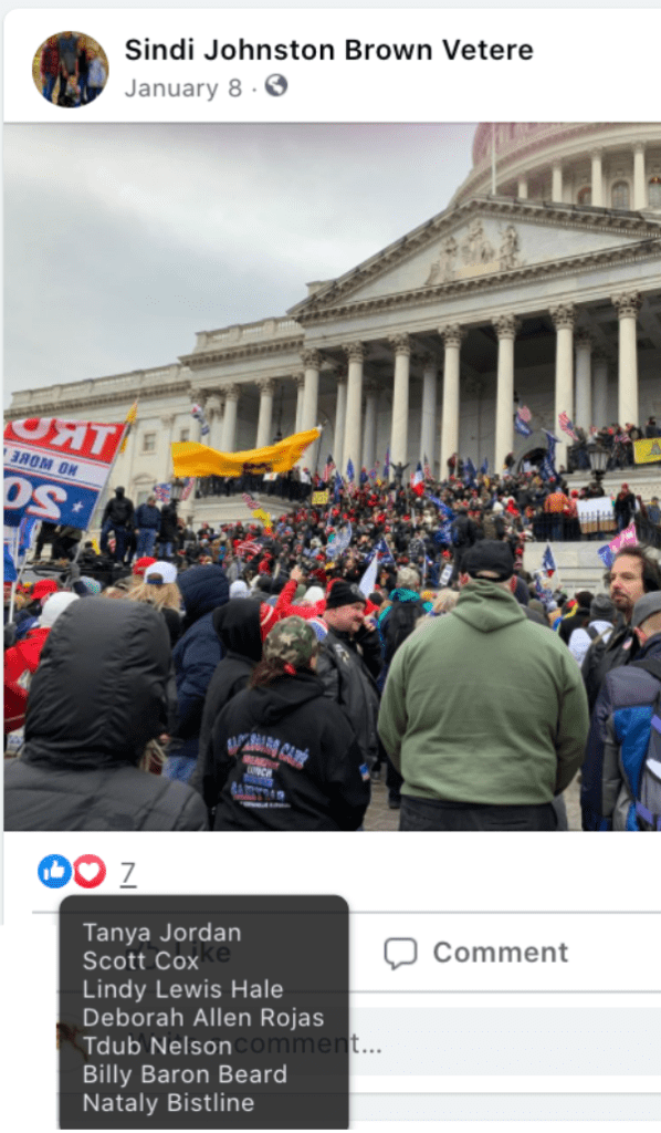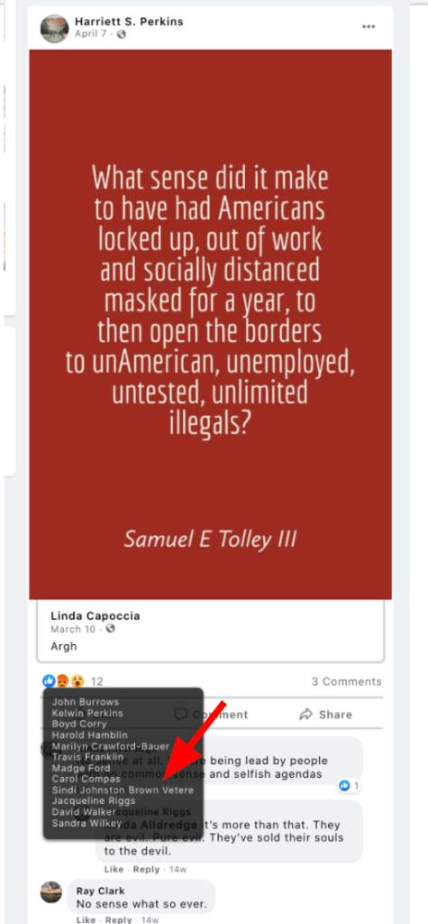 Sindi’s public posts includes her family’s attendance of the January 6, 2021 Stop-the-Steal turn Insurrection at the US Capitol. She promotes disproven election fraud & Insurrection Antifa involvement. Sindi encourages opposition to renaming DIXIE and to receiving blood from vaccinated donors. As such she joins the 75 Meet Your Neighbors: Red Level
