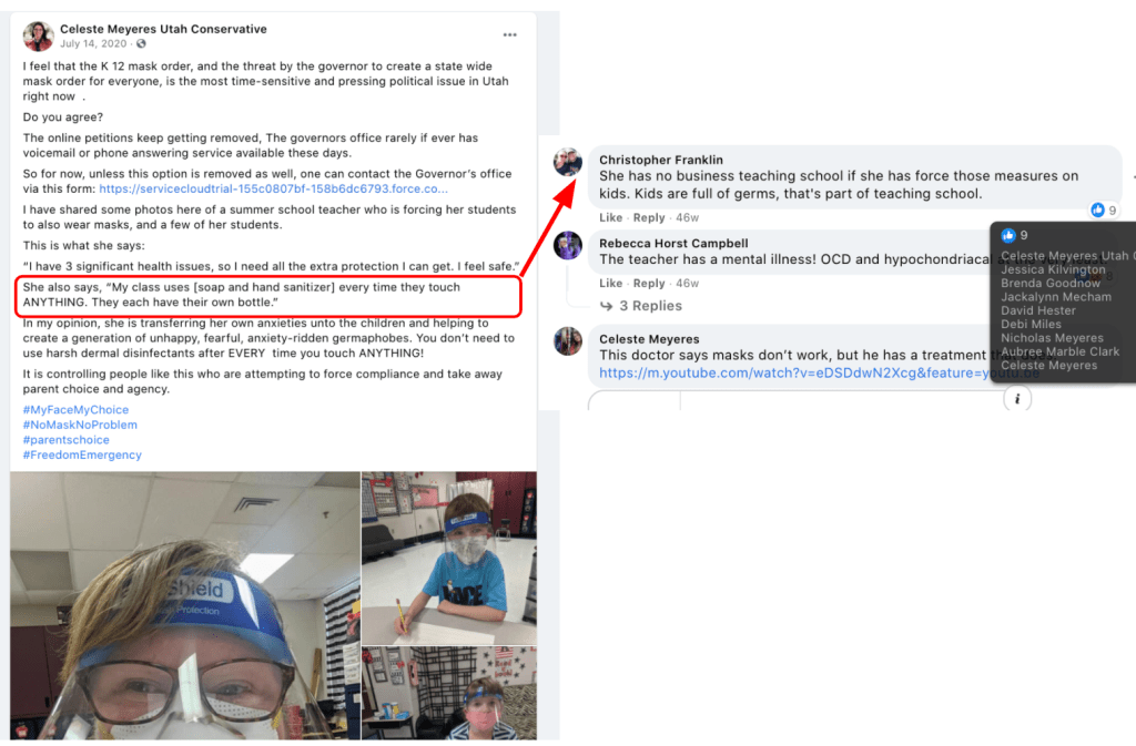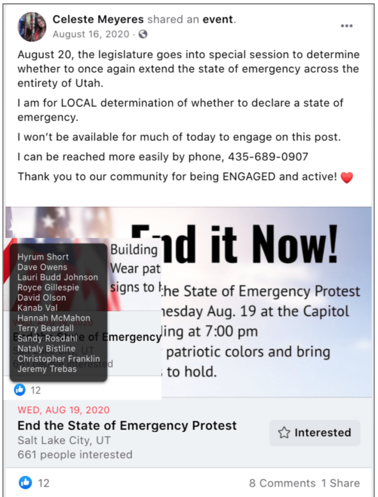 - Celeste Meyeres: Protest UT State Capitol for State of Emergency Declaration and Shame a teacher for following pandemic health safety procedures.