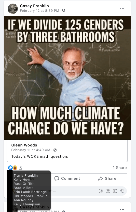 Evidence (see below) of extremism and bigotry exist for Byard Kershaw and Celeste Meyeres. The spouses of city employees share extremism or bigotry publicly as well: Trina Decker, Nicholas Meyeres and Carol Kershaw.