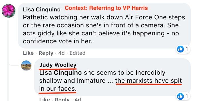 Sindi supports posts of extremism and/or bigotry by others in the area: