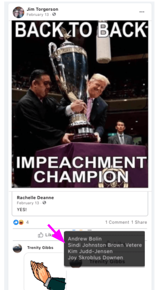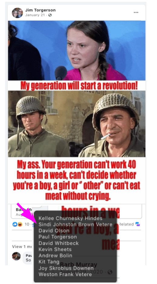 - Jim Torgerson: USA Veteran boasts two impeachments & belittling Thunberg’s generation (work, Trans-hate & vegetarian).