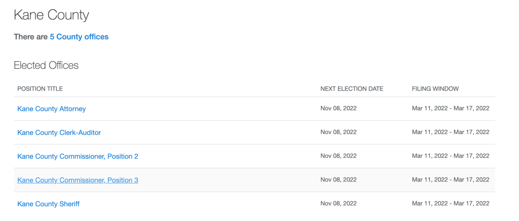 For County Positions, file March 11- March 17, 2022. https://www.runforoffice.org/districts/44085-kane-county