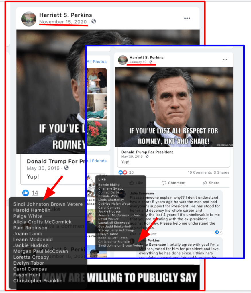 - Harriet Perkins: prolific posts of bigotry & extremism including. Sindi supports the following: All Lives Matter, LGBTQ Trans-hate, misinformation open borders & covid with false dichotomy to citizens, and loss of respect for Romney.