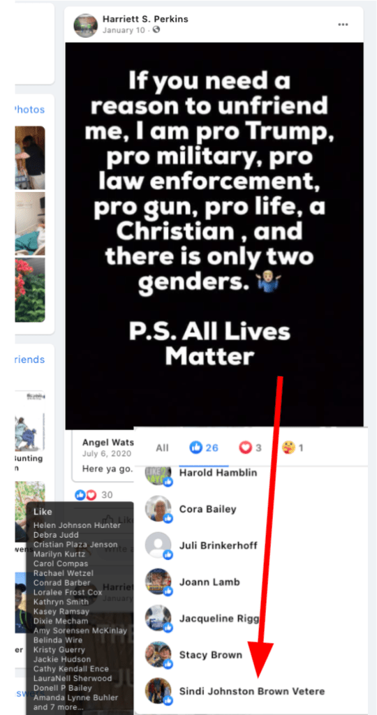 Local business owners & those with ties to law enforcement, military & public office who supported Sindi’s post are noted in red on images and listed below: