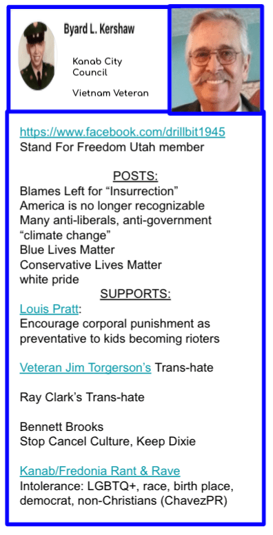 (Updated 12/19/2022). The 2021 election for Kanab Mayor and City Council included extremists candidates following the national trend. Each candidate in the image above has a dedicated section within the post below. The green stars in the image above indicate the winners of the election. Their declaration forms can be viewed here https://kanab.utah.gov/DocumentCenter/View/1485/Candidates.