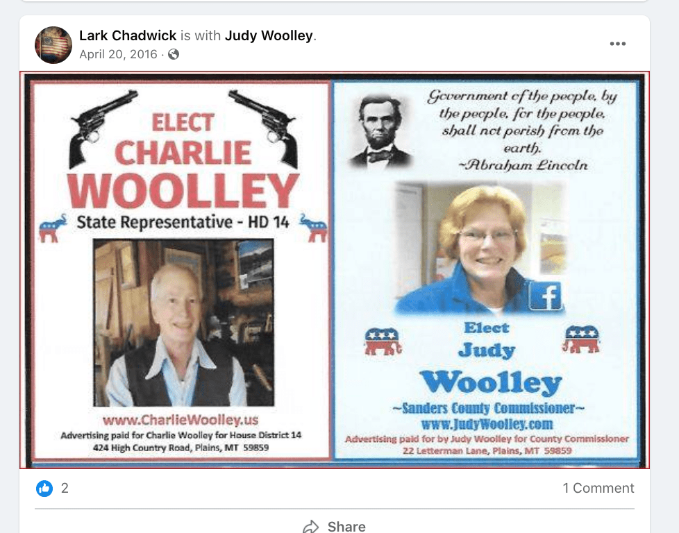 Judy and husband Charlie both unsuccessfully ran for public office in 2016 in Montana. Judy ran for Sanders County Commission and Charlie ran for State Legislature.