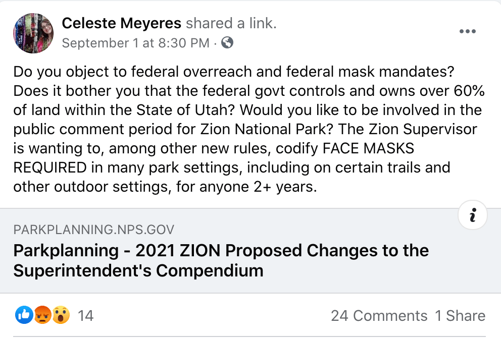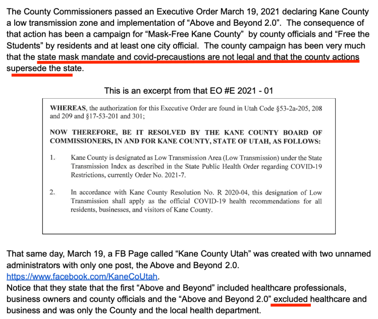 Two actions in Kane County nearly eliminate local action for 2021: (1) Kane County Schools made masks a personal choice 08/2021 and (2) Kane County Commissioners announced a premature end, 03/19/2021, to the state mask mandate set to end 04/10/2021. Some are turning their effort to nearby public land. One such leader in the effort is Kanab City Council member Celeste Meyeres.