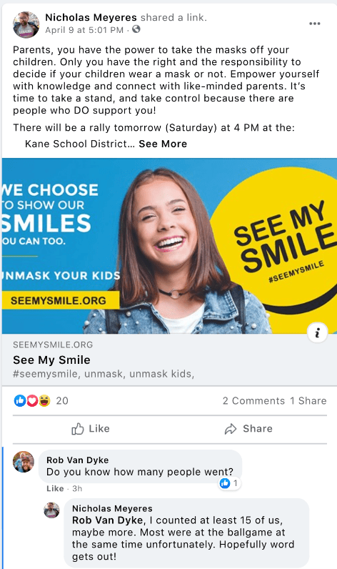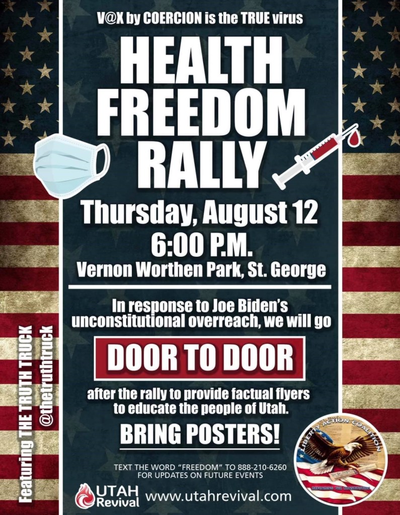 - 04/09/2021: Flier for the “Unmask Kids, See My Smile Protest 04/10/2021” at Kane County School District. In the replies is Rob Van Dyke. He is the county attorney responsible for the early termination of the state mask mandate and for the legal error in 2020 misapplying vehicle laws to pedestrians in efforts with Kanab City Police and Kane County Sheriff’s Office to control opposing protests at 89/89A between Black Lives Matter / No Trump and All Lives Matter / MAGA. (this will be the next KURW post in this series)