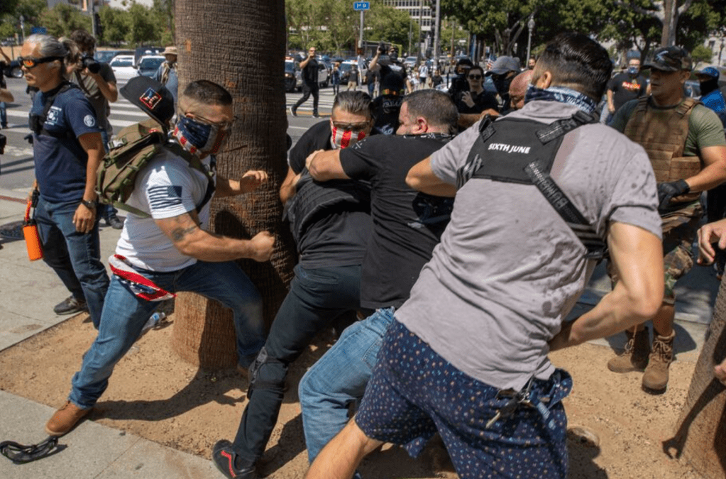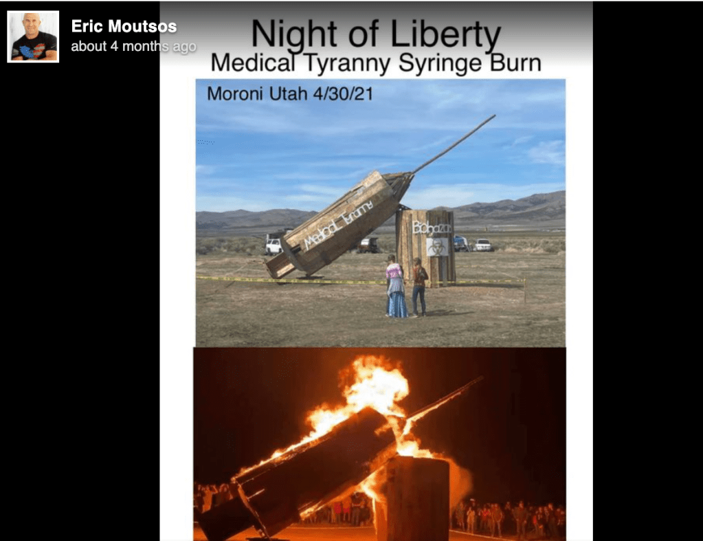 IREHR shared the Utah event (image lower right) covered by Vice News. Eric Moustsos resigned from SLC Police for refusing to participate in PRIDE events and led this burning with Ammon Bundy and Phil Lyman in attendance. Ammon’s People’s Rights Militia is showing up at these protests in WA, recently closing down schools.