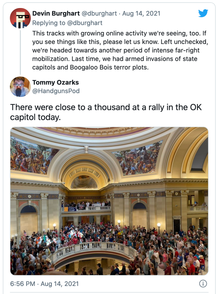 Burghart works for IREHR (Institute for Research and Education on Human Rights) which asks everyone to contact them with any anti-mask/vax/mandate events https://www.irehr.org/contact/. As always, if you see plans of violence or attacks, contact local law enforcement and the FBI. If the threat is immediate, call 911.