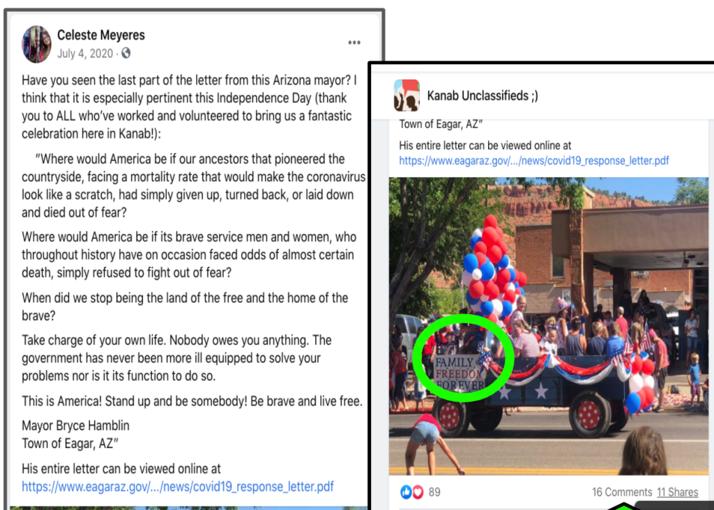 - 07/04/2020: Posted portion of letter from Arizona mayor in local FB group “Kanab Classifieds” encouraging residents to “Take charge of your own life…Stand up, be brave and free…The government has never been more ill equipped to solve your problems, nor is their job to do so.”