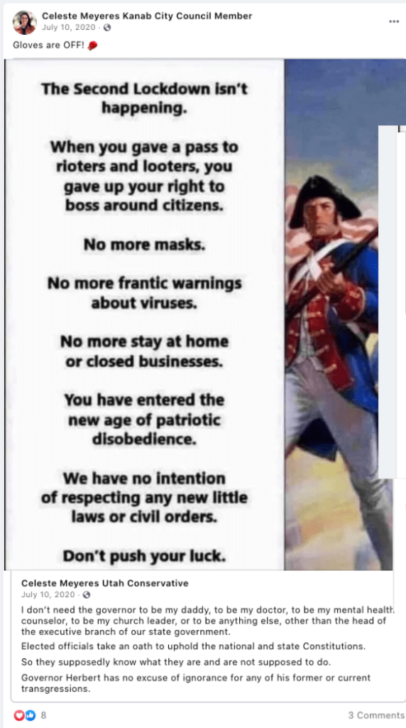 - 07/10/2020: The “Gloves are OFF” version of her Patriotic disobedience call to fight was posted to her political pages and modified to “K12 mask mandate is too far” for the local Kanab Unclassified group.