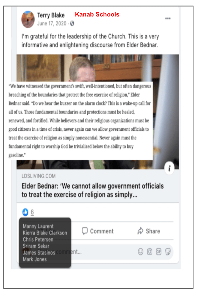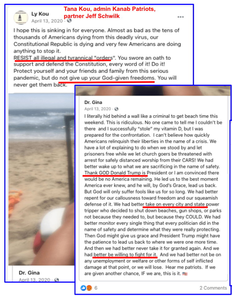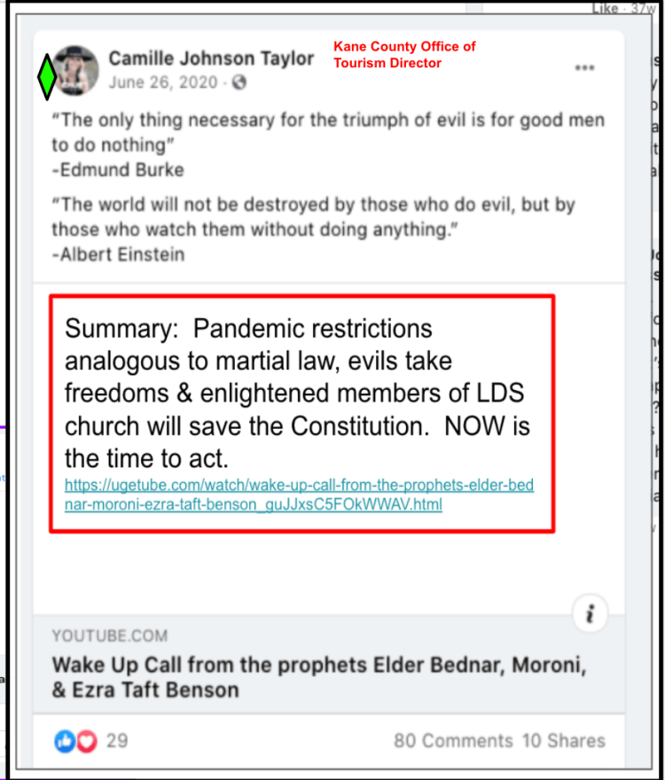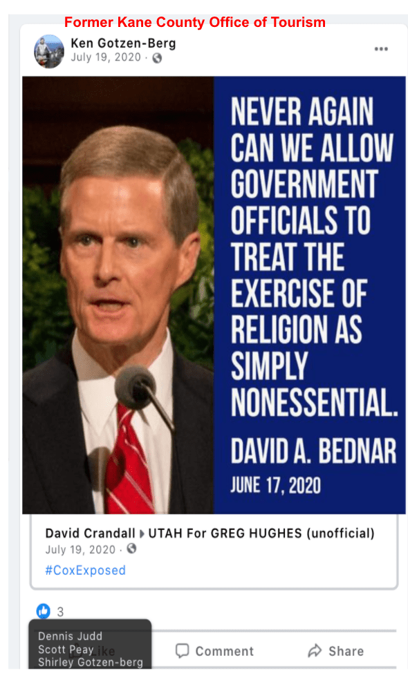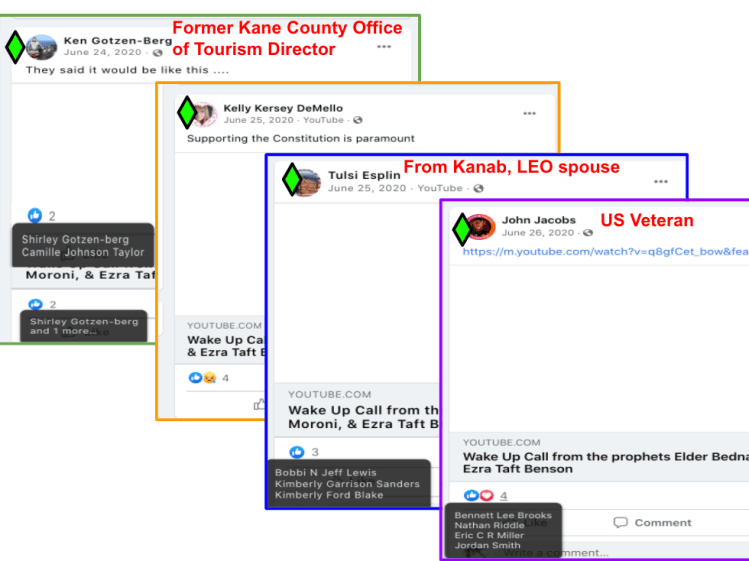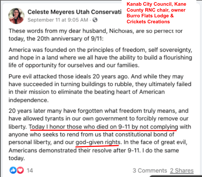 Part three (updated 11/12/2021) features LDS, Evangelical, God given rights & honoring victims of 9/11 in posts of calls to fight and defy public health safety during the Covid Pandemic. These posts are from residents of the Kanab/Fredonia area of Southern Utah and include law enforcement, veterans, county employees & officials, city official, school employees, health care professionals, animal welfare employees, and hate group founder. The posts are supported by business owners, former law enforcement, former City Council, recent Mayoral candidate, veterans & hate group founder.