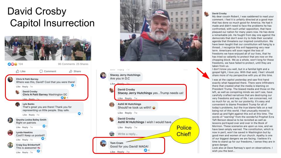 Background: Dave fits the profile, and I was absolutely shocked to see him at the Capitol and to read his posts of fear, anger, betrayal, secret combinations, Satan, compelled to act now. DHS describes the new right threat to local politicians and journalists, emboldened by the Capitol Insurrection. The Google Presentation below is a list of his public posts and interactions on FB by category: Insurrection, Extremism, Bigotry, Justice & Equality, Politics & Covid, and Politicians & Voters.