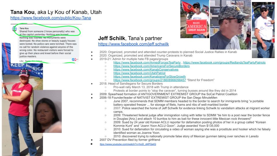 - Friend of Ly “Tana” Kou of Kanab, Utah. Partner of hate group founder and veteran Jeff Schwilk from Oceanside, CA, 2016.