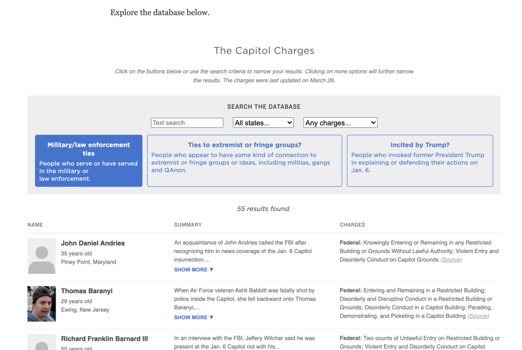 Deep dive: Use this NPR database to read each of their stories and arrests. You can search by state, keywords and/or characteristic : as seen in the image below (55 military/law enforcement as of 03/30/21)