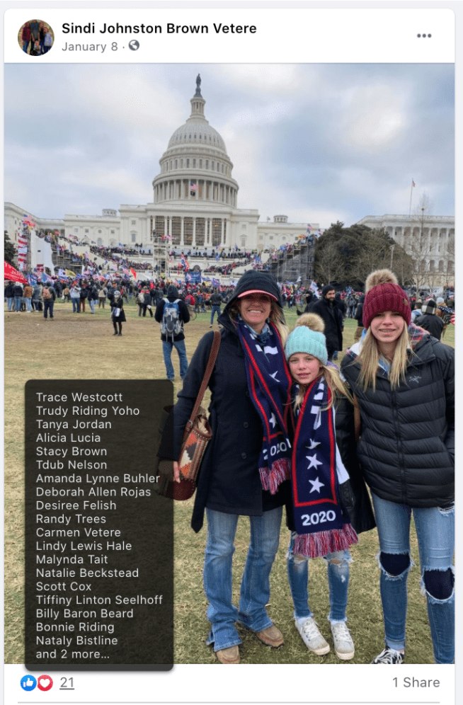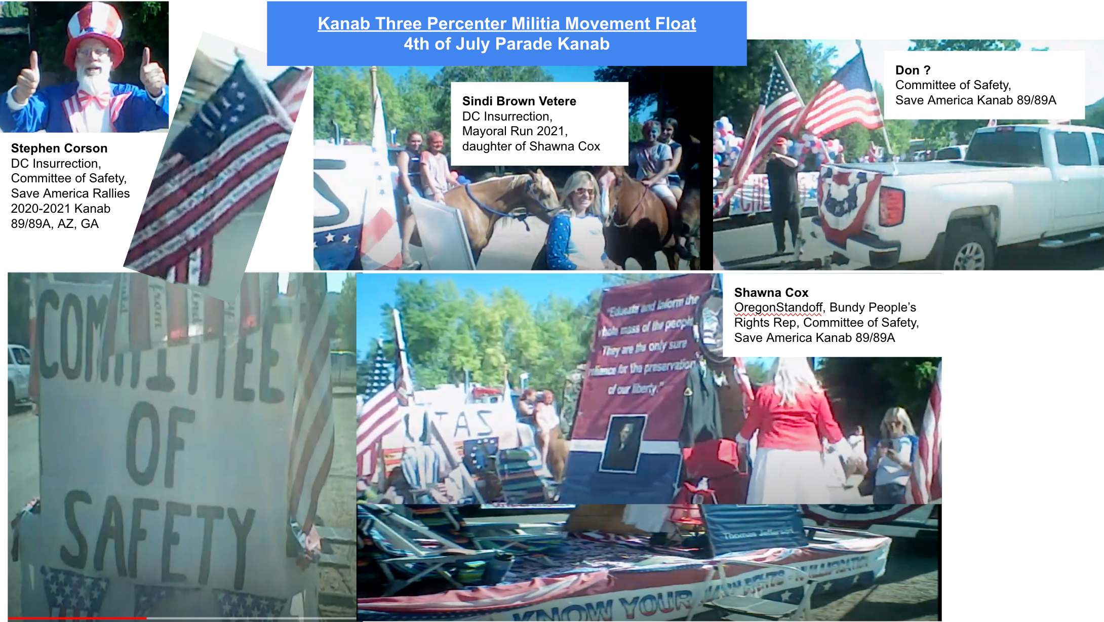 - Sindi Johnston Brown Vetere and mother Shawna Cox of Kanab, Utah. Sindi’s posts & Corson’s videos reveal that Sindi & Shawna were inside the capitol and near Ashli Babbitt when she was shot. After their return, Sindi ran for Mayor of Kanab, Utah. She owns AA Sanitation and the Kanab Sinclair building. Sindi, spouse Frank Vetere & employee Phillip Torgerson were ARRESTED 07/2023 for dumping raw sewage on private property near Asay River (see KSL news article. )Shawna Cox formed the Kane County Committee of Safety, hosted a Constitution class & as area representative for Ammon Bundy’s People’s Rights Movement promoted his 04/2021 event at Kanab Center. Together with Steve Corson & Colleen Houston they hold rallies, classes, booths & floats with group name “Committee of Safety” with III%er flags.