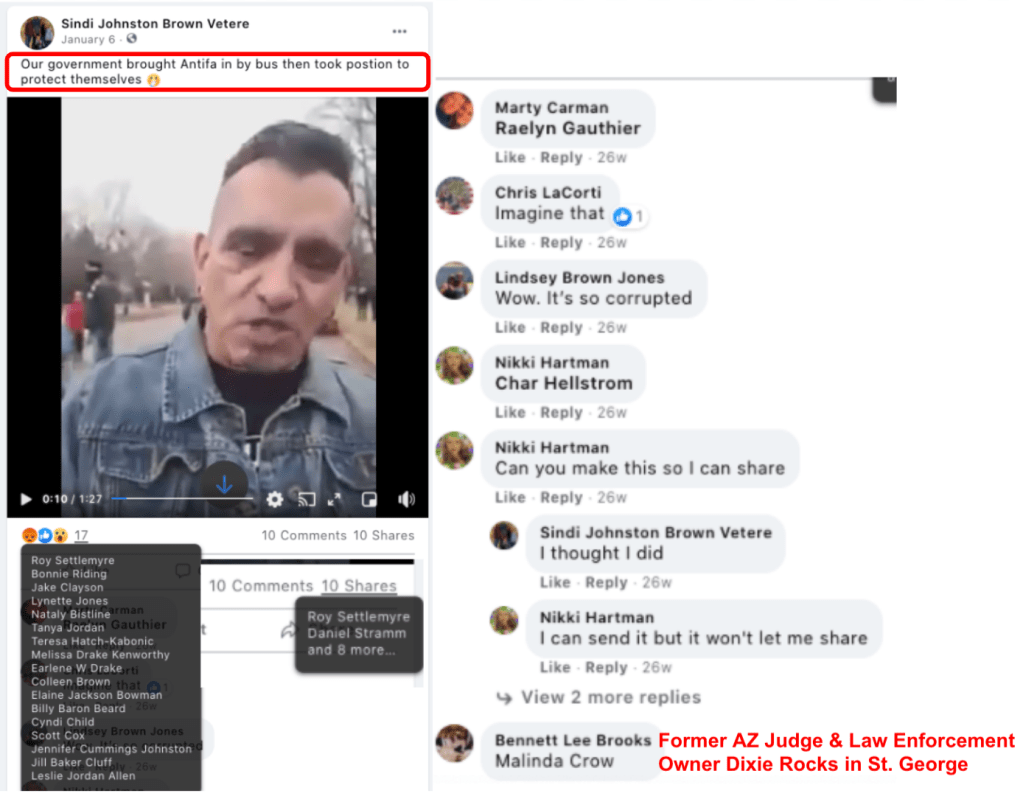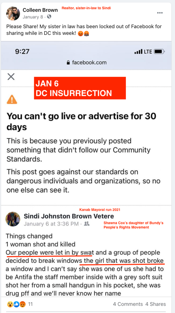 Sindi’s posts & photos reveal that she was inside the capitol, #seditioninsiders. Sindi took her children and claimed “our government brought Antifa by bus then took position to protect themselves”. After returning from DC, Sindi ran for Kanab City Mayor.