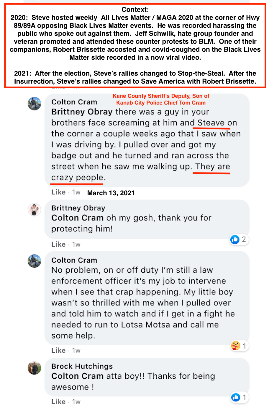 Police Chief Tom Cram and his son Colton Cram, deputy at Kane County Sheriff’s Office, show their support of David Crosby and Steve Corson. The Cram family members are all in law enforcement or employed by Kanab City or Kane County (see Google Slideshow end of this section and KURW post Meet Your Neighbors: Red Level).