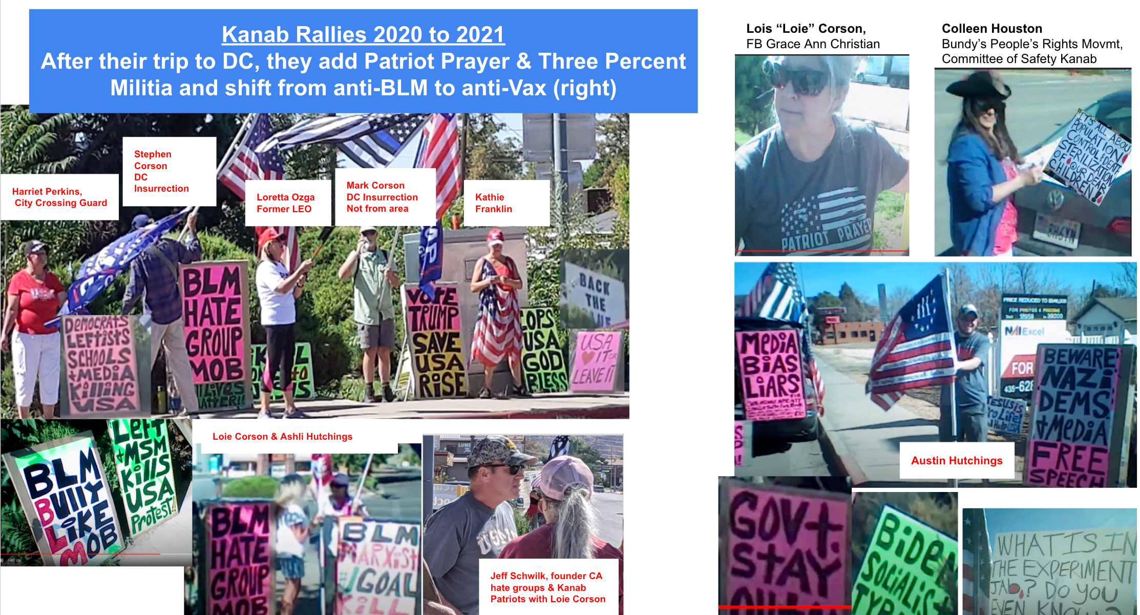 Background: This was not their first trip of extremism to DC. In 2011, Lois & Stephen carried crosses from Utah to DC. For years, they have displayed their beliefs on the roadsides of Kanab and neighboring Fredonia, Arizona. Those signs have shifted from religious & pro-birth signs to All Lives Matter, MAGA & Stop-the-Steal in 2020 to Save America, Don’t Tread on Me, III% & Anti-vax/Anti-Mask in 2021. They have expanded to forming a “Committee of Safety” group with booths at events, classes & a III% float in Kanab’s 4th of July parade. Following the June 04, 2020 Justice for George Floyd March in Kanab (see SLTRIB article), Steve & Lois joined by Kanab Patriots & residents, began weekly hate rallies at 89/89A.