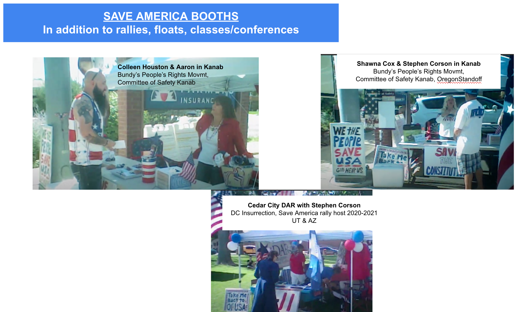 Upon returning from storming the US Capitol January 6, 2021, Corson continued his roadside rallies in Utah & Arizona with themes of “Save America”, “Medical Freedom” and protesting Planned Parenthood. He joined Ammon Bundy’s People’s Rights Network (see KURW post Ammon Bundy’s People’s Rights Recruitment in Kanab. Kudos Kane County Office of Terrorism) and fellow J6er Shawna Cox’s Committee of Safety. The Committee of Safety hosted presentations on the US Constitution, booths at local events like Western Legends and a float in Kanab’s 4th of July parade 2021 adorned with a III% flag. Their preparedness fair was promoted, attended and praised by recently elected Kane County Commissioner Patty Kubeja.