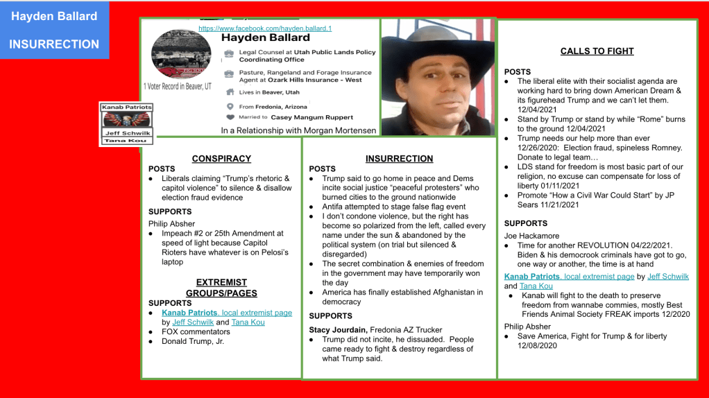 HAYDEN BALLARD is a Utah Public Lands Attorney, Insurance Agent & a Kanab Patriot whose posts reflect a deep passion and defense of J6. There is no direct evidence putting him there. Ballard is from neighboring Fredonia, Arizona and lives in Beaver, Utah.