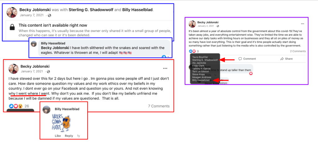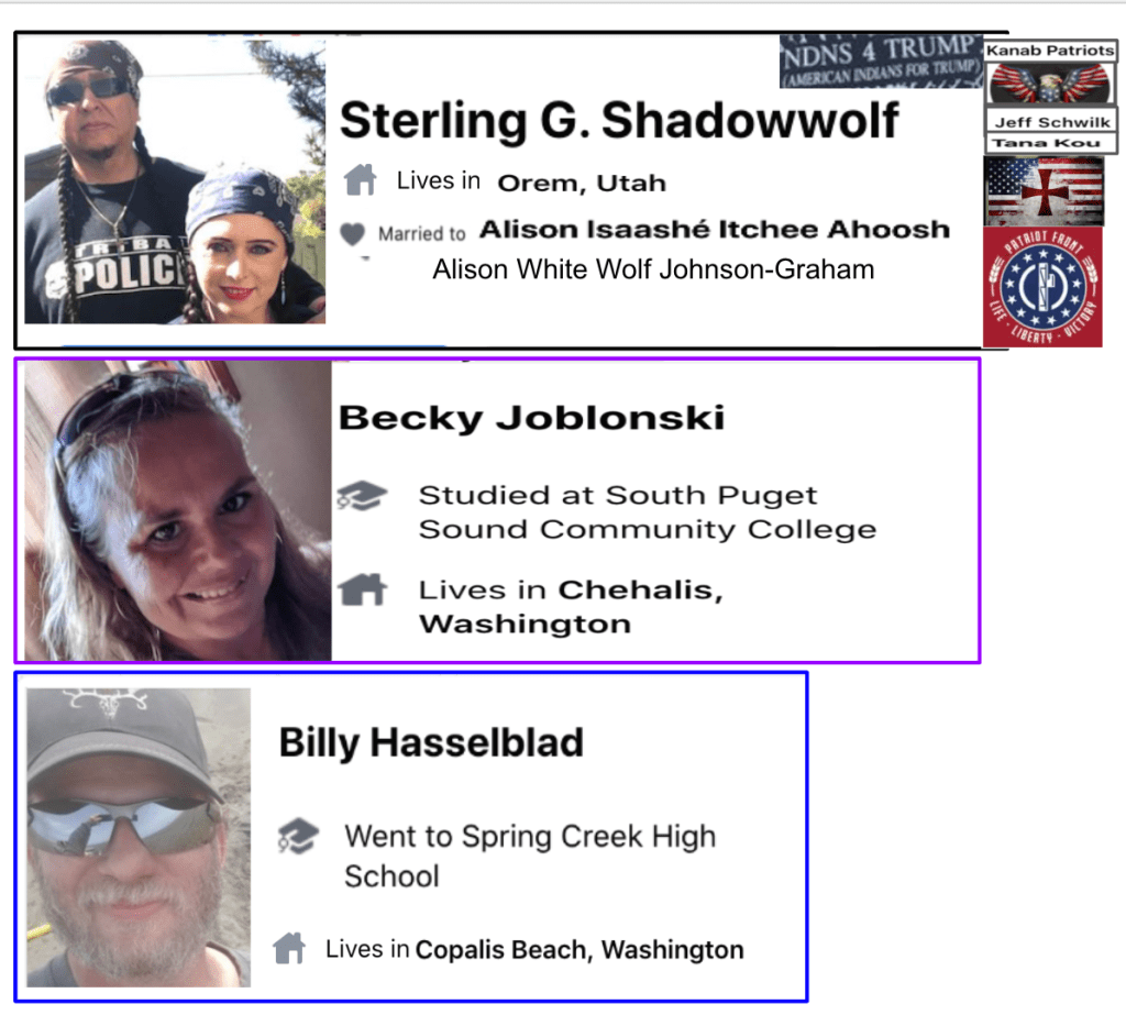 Beck Joblonski from Chehalis, Washington posts extensive calls to fight in 2020, election fraud and on Jan 7 “I’ve been stewing two days…why I went where I went”. Her posts near January 6th include tagging Billy Hasselblad of Copalis Beach, Washington & Sterling Graham Shaddowwolf of Orem, Utah. Shadowwolf is a Kanab Patriot & posts extensive extremism. For now, this is a sample of their engagements related to January 6 and will be updated soon. Please contact me at mgalaria@protonmail.com for corrections & the FBI for additional information.