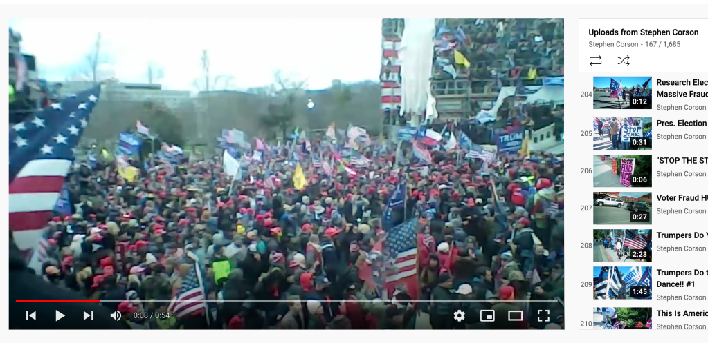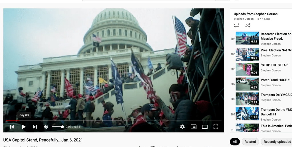 Social media posts on FB profile Grace Ann Christian and Jeannine Corson report that Stephen Corson and his brother Mark Corson were at the Capitol. Steve posted some of these videos on his YouTube channel “Stephen Corson” https://www.youtube.com/channel/UCsFlyL5qZ2RvCYDsLZjUKvw/featured but none of “the attack” mentioned on Facebook. This channel was suspended by YouTube for violating policy. He then started a second channel “Freedom4USA” https://www.youtube.com/@freedomforusa and posted some of that video there with additional footage of the violence (flash bangs) and him standing behind a person with a bat.