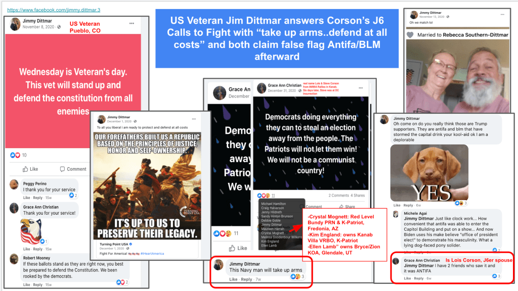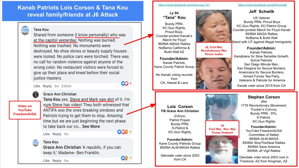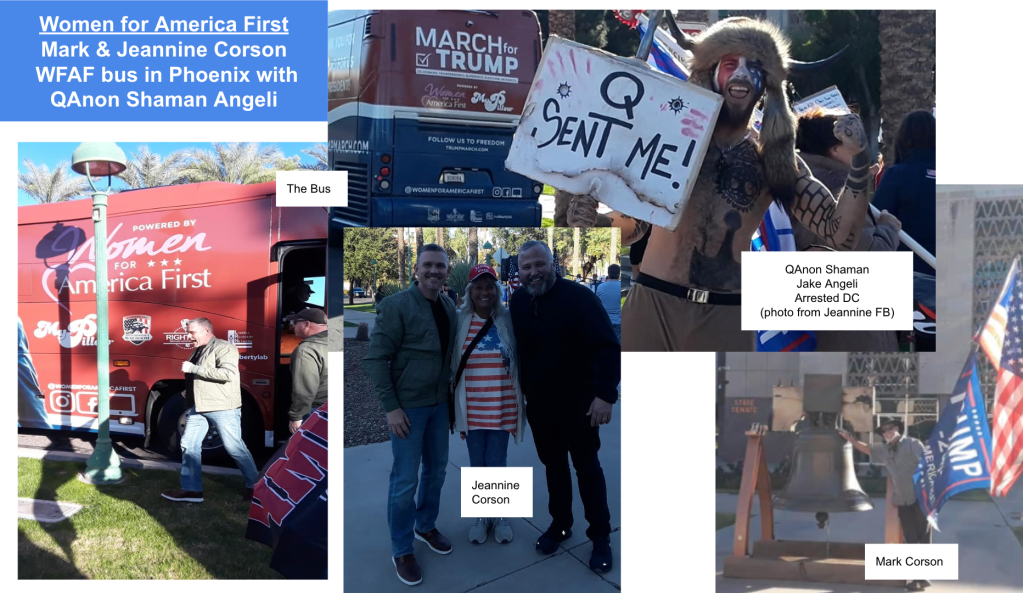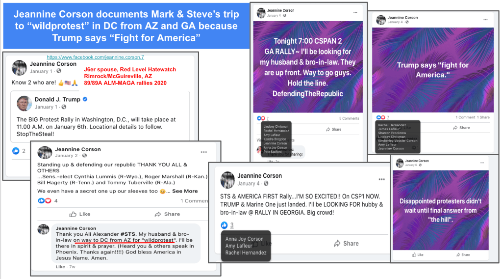 Jeannine and Mark Corson of Rimrock/McGuireville, AZ attended rallies in Kanab and Arizona (one with QAnon Shaman) and Mark continues traveling with Steve to rallies at the 2023 SuperBowl and elsewhere. Lois Corson advertised a bus for Stop-the-Steal at DC and Jeannine documented their trip to a “wildprotest” at DC from rallies in Arizona and Georgia because “Trump says to fight for America!”