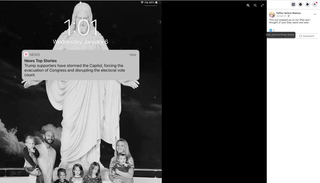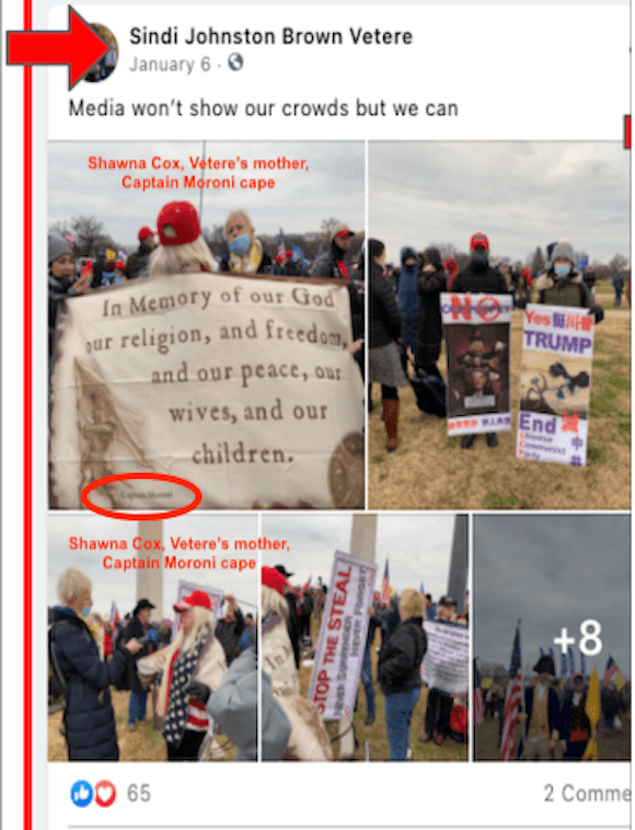 Slideshow of Vetere’s photos from J6 revealing her family presence, LDS calling, presence behind barricade of US Capitol, claims of false flag, and support by local business owners, first responders & public officials.