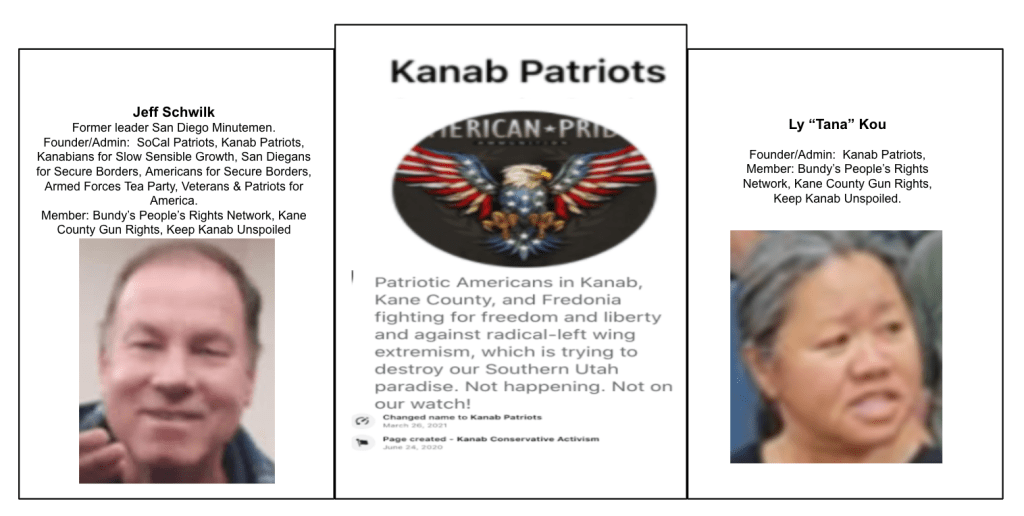 Co-founders Jeff Schwilk & Tana Kou moved to Kanab from Southern California in 2018. Jeff had some legal battles with hate groups he had founded there and already had other FB extremists pages before starting Kanabians for Slow, Sensible Growth and Kanab Conservative Activism now Kanab Patriots. His California activity was covered extensively by Southern Poverty Law Center (non-profit organization tracking hate groups) from 2007-2018 before moving to Kanab.