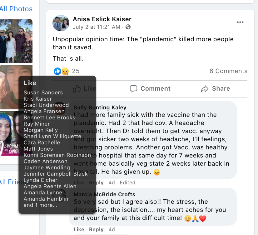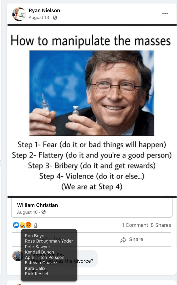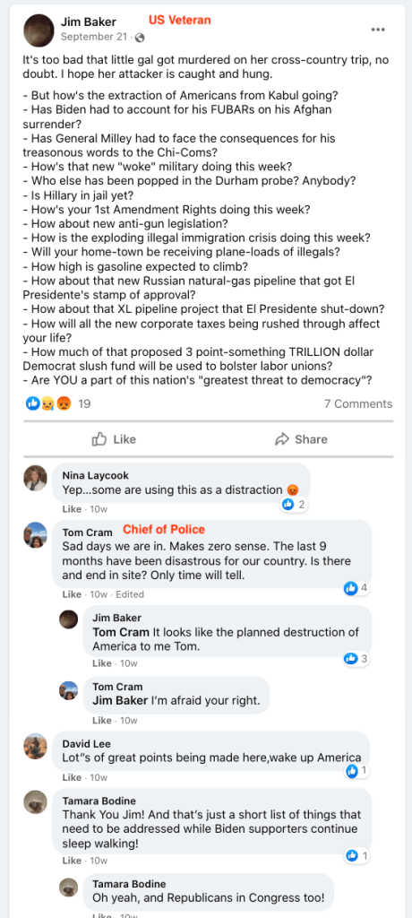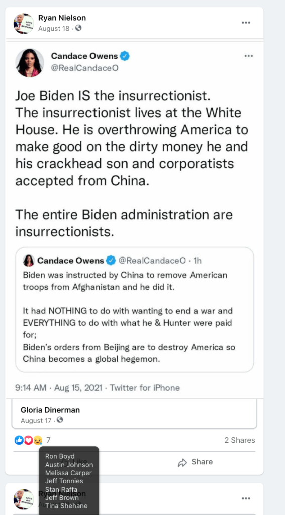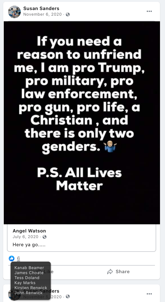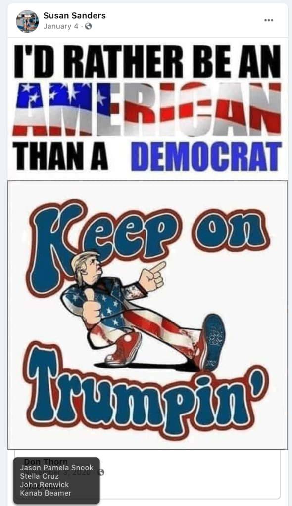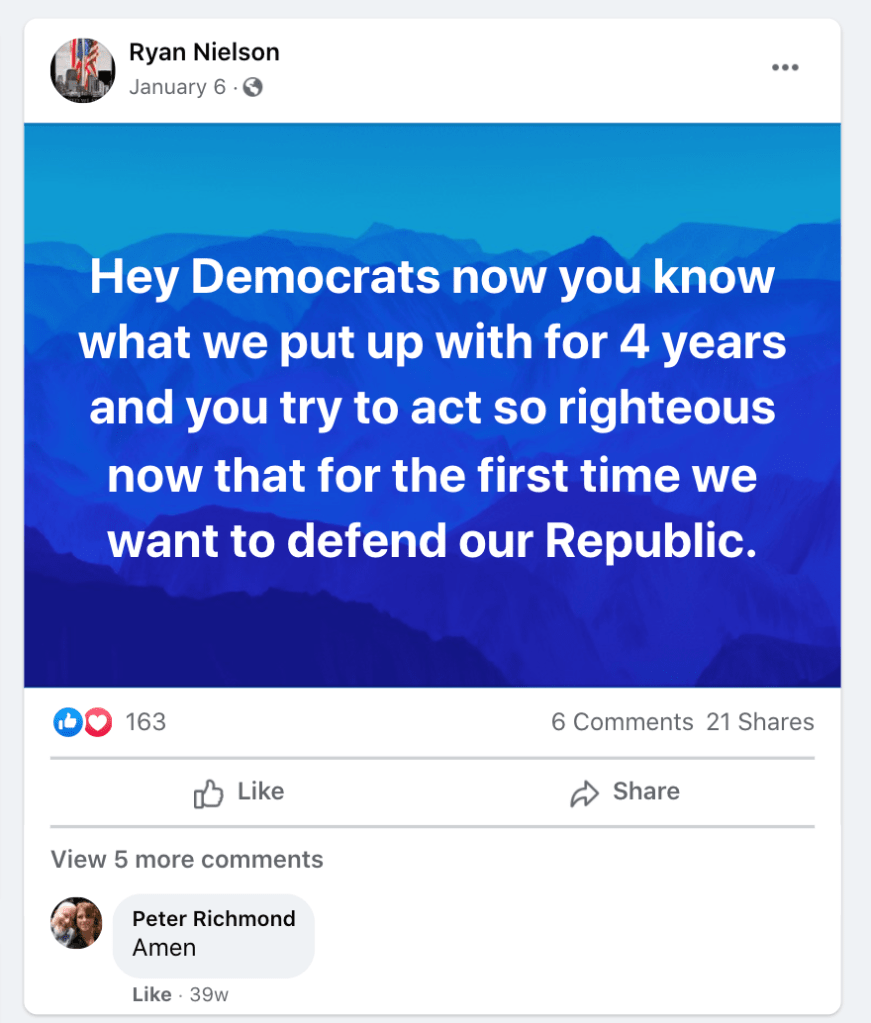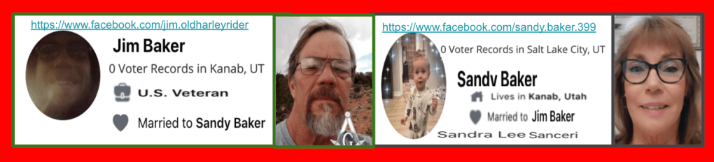 The content of the posts from Jim Baker & Ryan Nielson raise suspicion to their participation and their demographics (US Veteran & former law enforcement) align with that of arrested seditionists. Jim’s spouse Sandy does not post much but does engage with Kanab Patriots, she was featured in the KURW Post Meet the Kanab Patriots (last names A-C). Ryan’s spouse Lauri works in healthcare and was featured for her anti-mask/anti-vax posts in the KURW Post Medical Freedom At ALL Costs: Arrest Me, Kill Me!.
