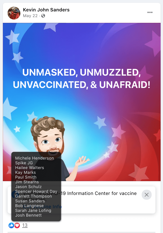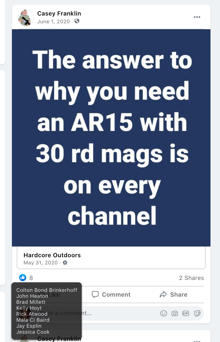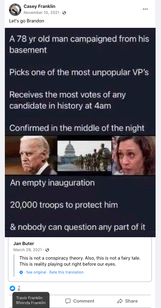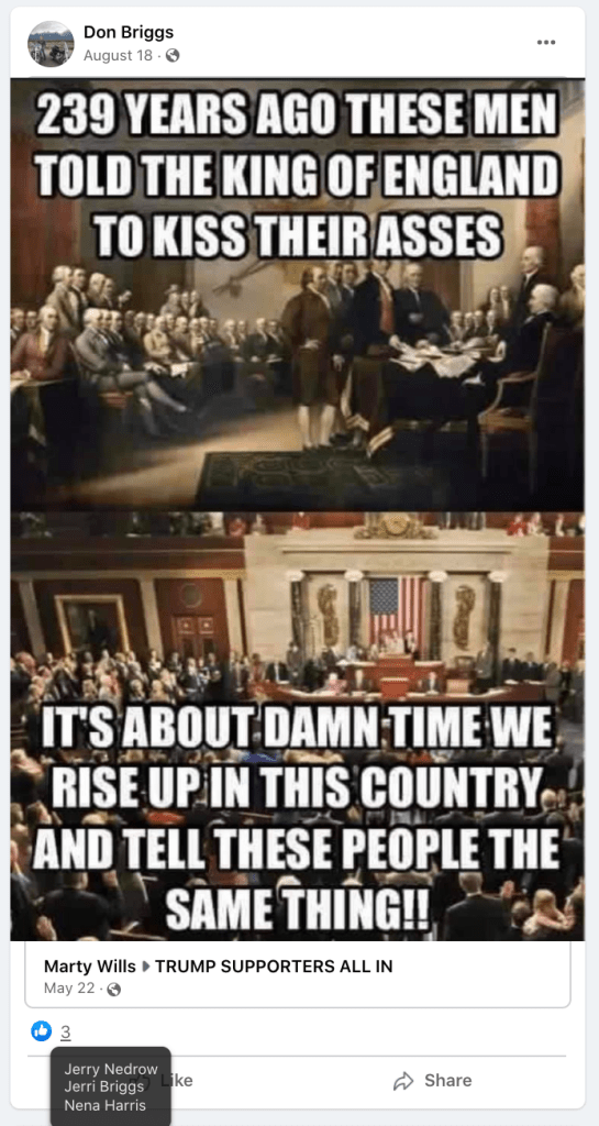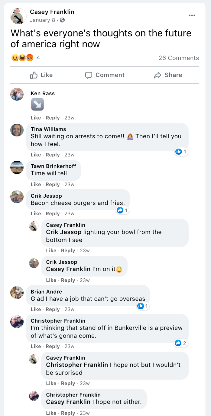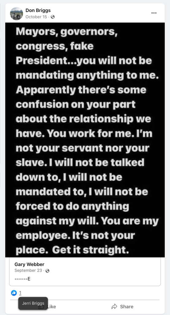 The content of the posts from Jim Baker & Ryan Nielson raise suspicion to their participation and their demographics (US Veteran & former law enforcement) align with that of arrested seditionists. Jim’s spouse Sandy does not post much but does engage with Kanab Patriots, she was featured in the KURW Post Meet the Kanab Patriots (last names A-C). Ryan’s spouse Lauri works in healthcare and was featured for her anti-mask/anti-vax posts in the KURW Post Medical Freedom At ALL Costs: Arrest Me, Kill Me!.