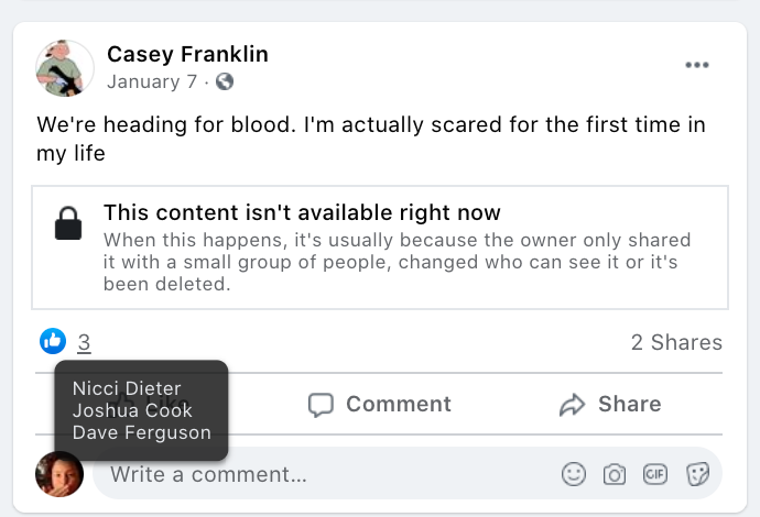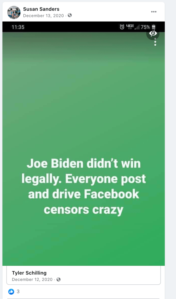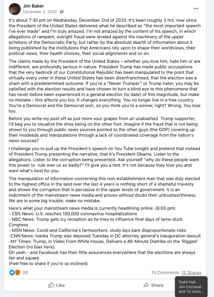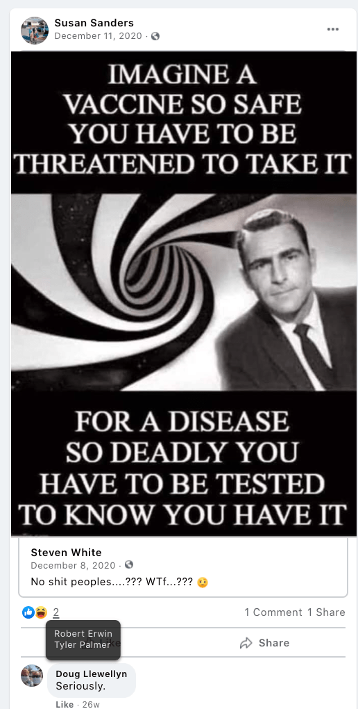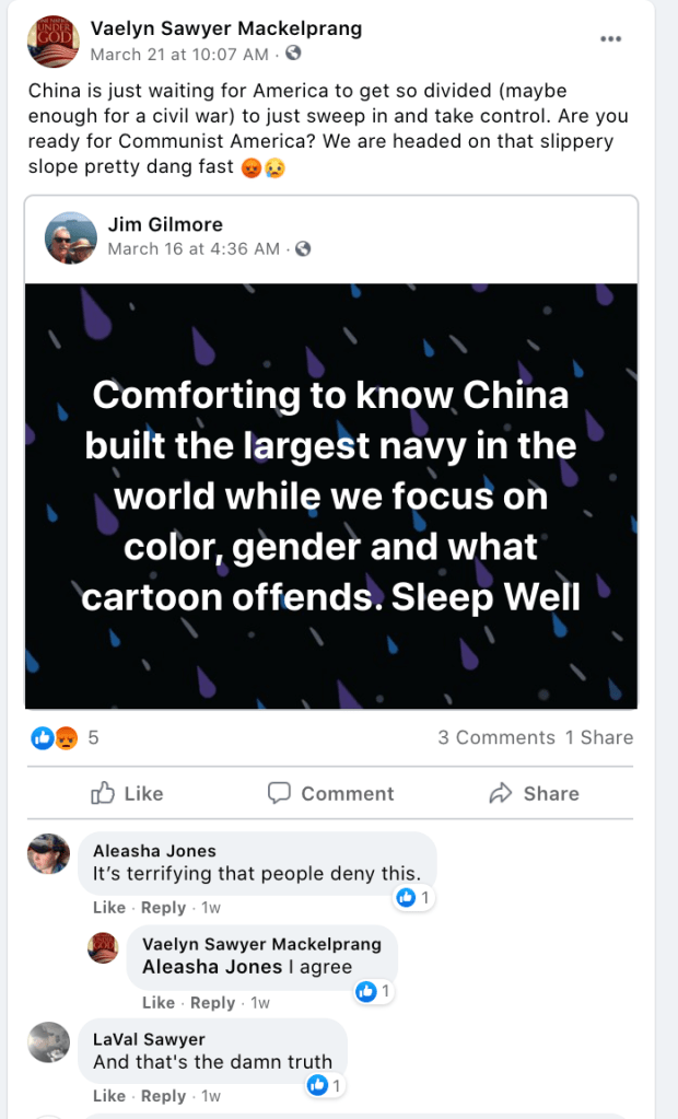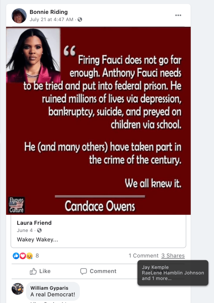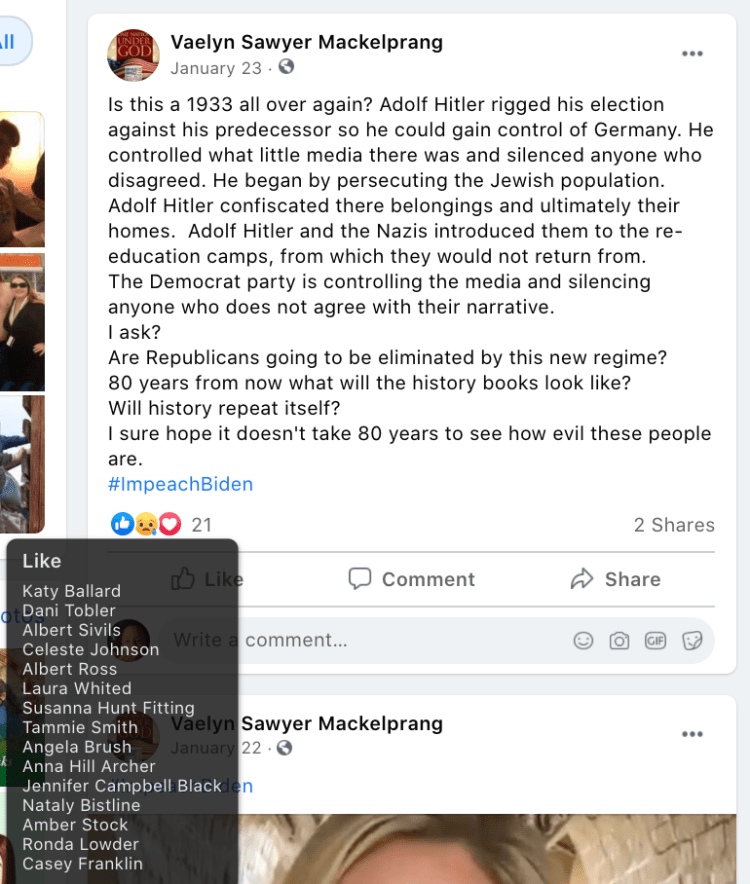 The content of the posts from Jim Baker & Ryan Nielson raise suspicion to their participation and their demographics (US Veteran & former law enforcement) align with that of arrested seditionists. Jim’s spouse Sandy does not post much but does engage with Kanab Patriots, she was featured in the KURW Post Meet the Kanab Patriots (last names A-C). Ryan’s spouse Lauri works in healthcare and was featured for her anti-mask/anti-vax posts in the KURW Post Medical Freedom At ALL Costs: Arrest Me, Kill Me!.
