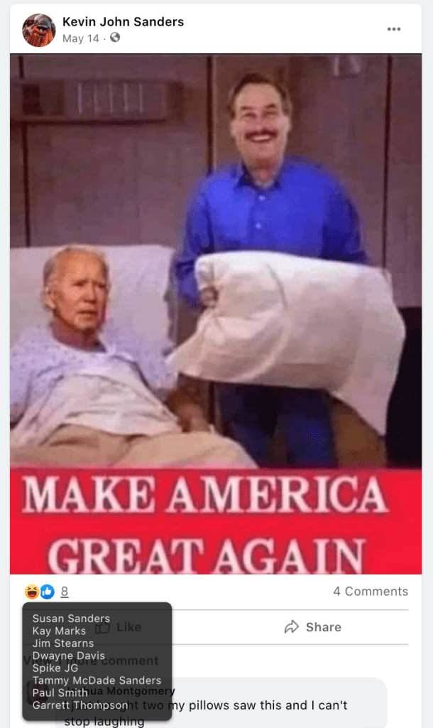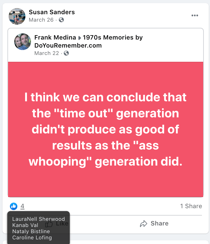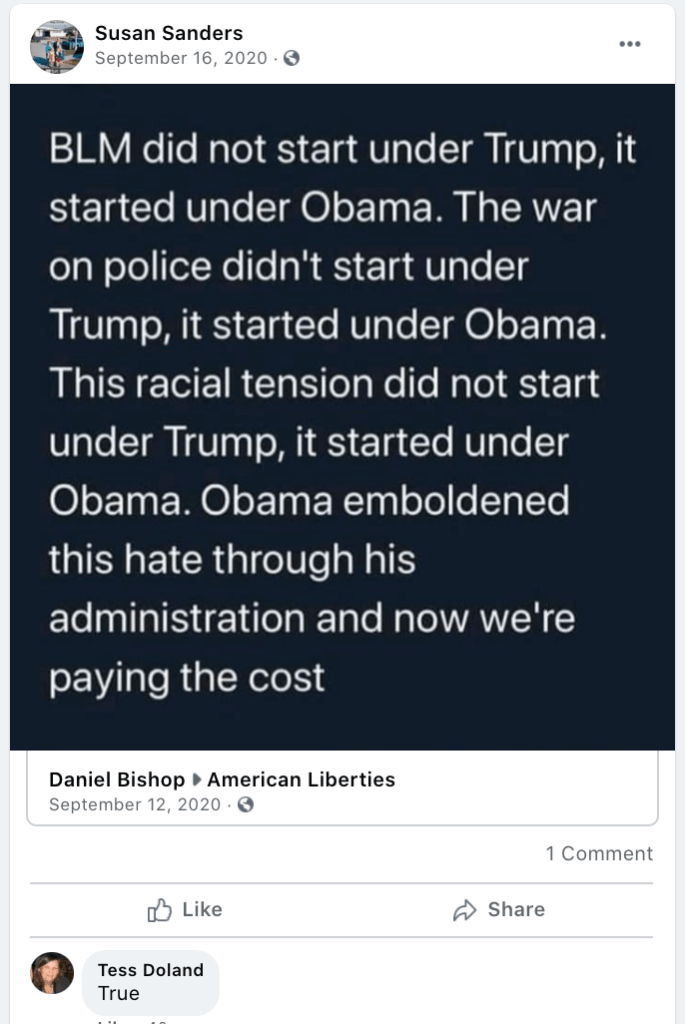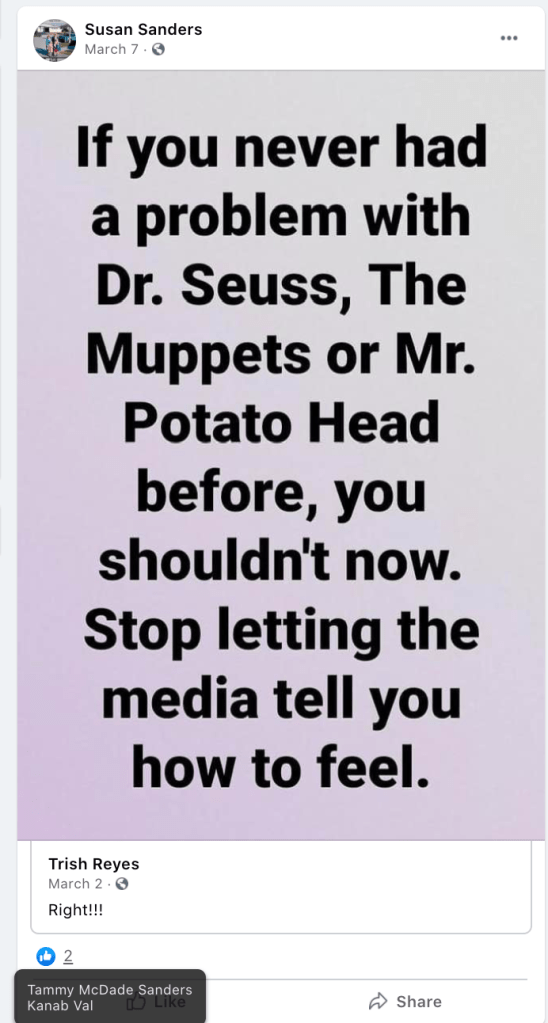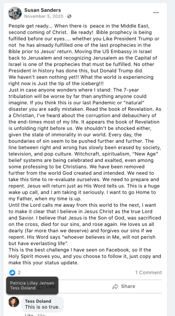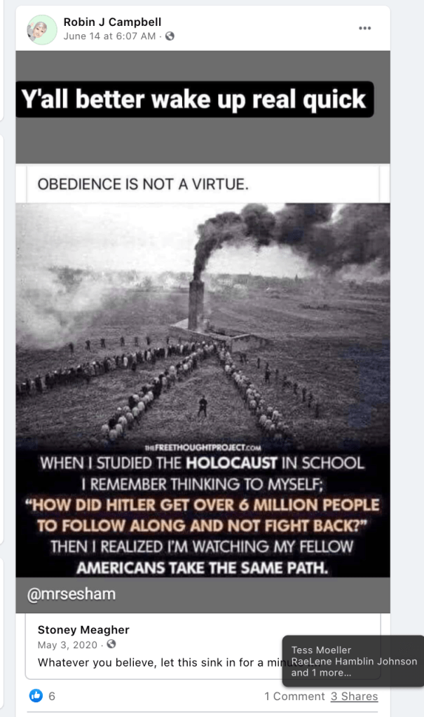 Susan’s daughter, Sarah Lofing, was featured in KURW post Shabby Iris Cottage Cakery: Sarah Lofing. Susan promotes violence (kill Biden & spank children), portrays USA 2021 as Nazi Germany, ridicules social/racial equity efforts, posts/supports bigotry of liberals & LGBTQI2S, end of times and anti-mask/anti-vax disinformation & divisiveness.