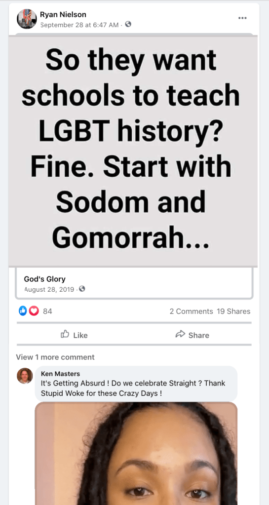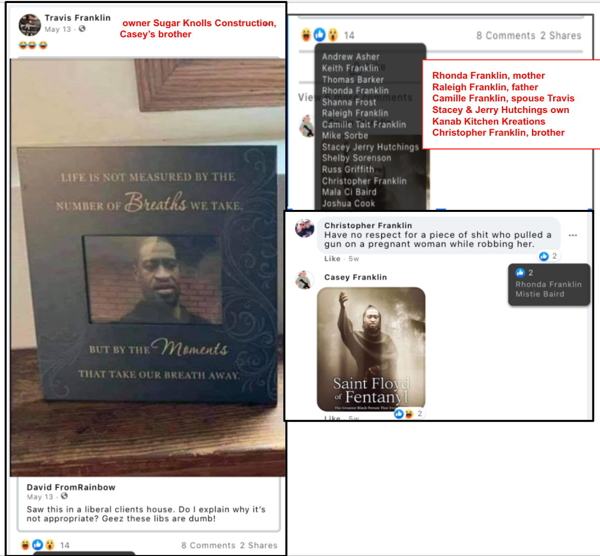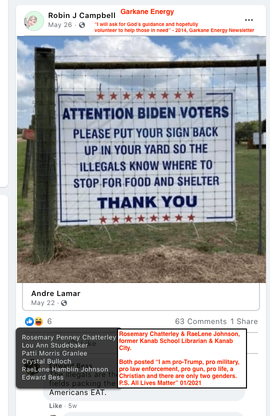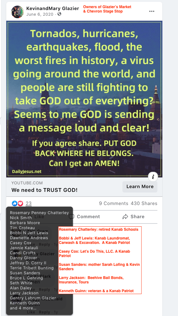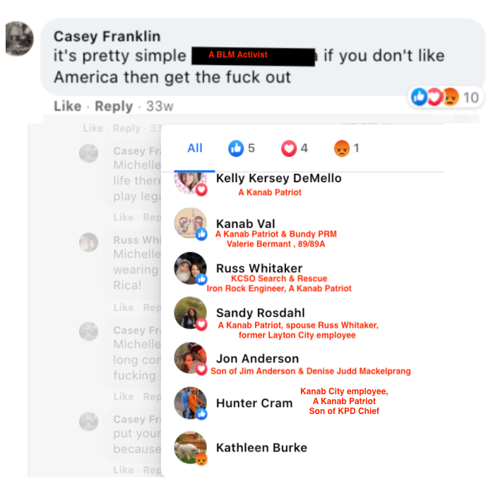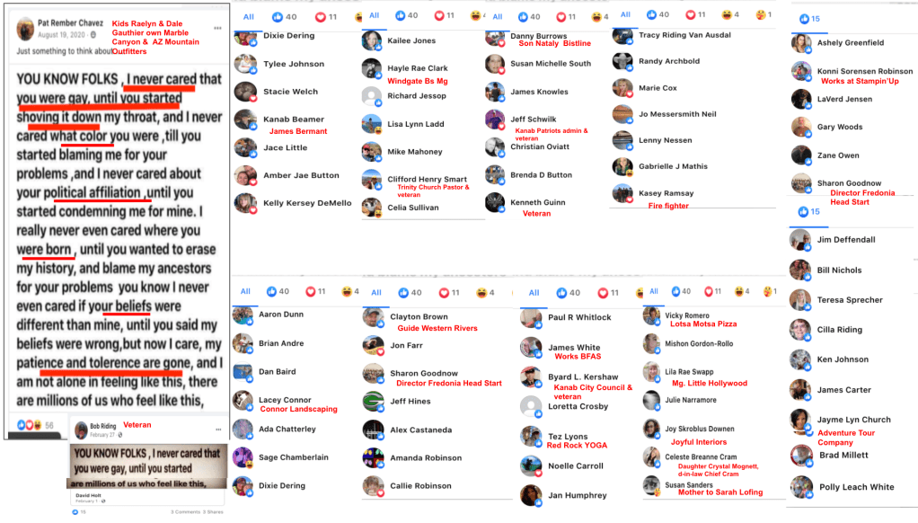 The Franklin family of Glendale were exposed in other KURW posts, with a focus on the other members. Casey’s brother Christopher filed to run for mayor of Kanab in 2021 so was featured in Meet the Candidates: Kanab Mayor & City Council 2021. Casey’s brother Travis owns Sugar Knoll Construction so is featured in KURW Business Directory of Extremism & Bigotry. Their parents, Raleigh & Rhonda, joined the boys in posts of LGBTQI2S Bigotry and were featured as a family in Bigotry LGBTQ+ (Part Two of Three).