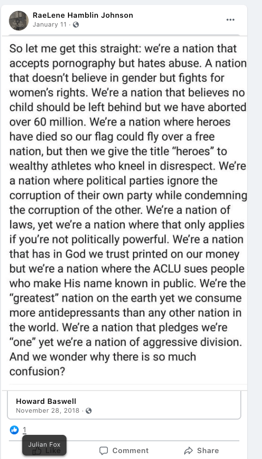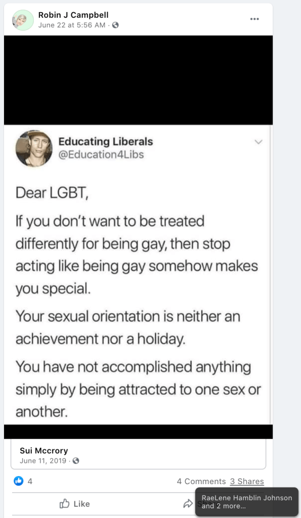 Gay Brinkerhoff provides an example of hypocrisy. Some will post messages of inclusion and/or stopping division or political posts right along with the exact content they just posted against. Gay does this with LGBTQI2S bigotry by posting a religious reminder of inclusion amid her posts & supporting the bigotry of others.