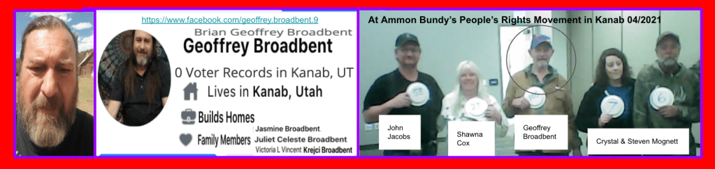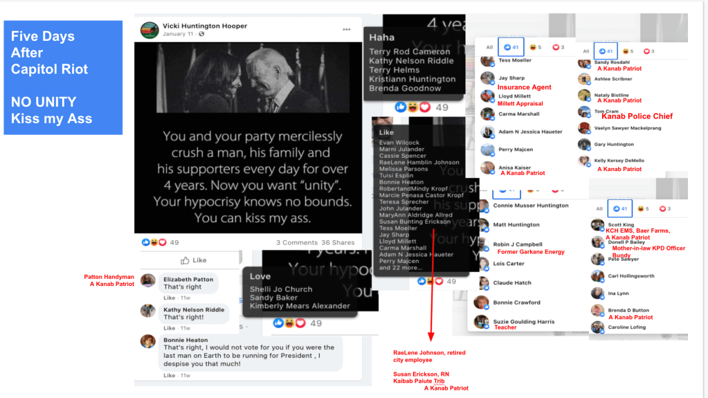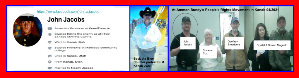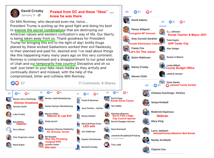 Jim Baker and Ryan Nielson present the most concern of the group of nine because of their persistent posts about the January 6th Capitol Riot (see slides following this paragraph). KURW exposed four of the claimed group of 11 from Kanab who went to DC January 6th (Sindi Brown Vetere, David Crosby, Stephen & Mark Corson, all listed in section 2/3).