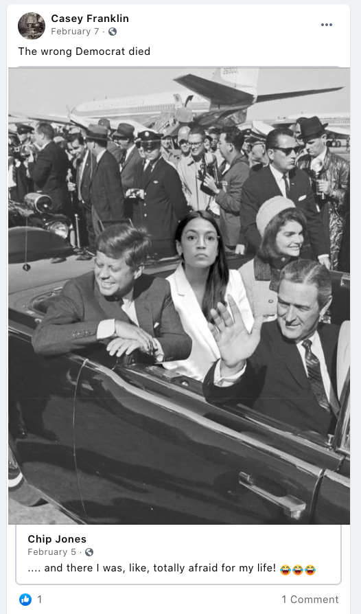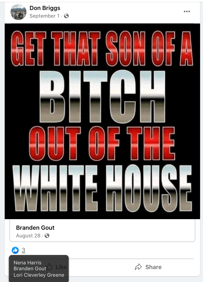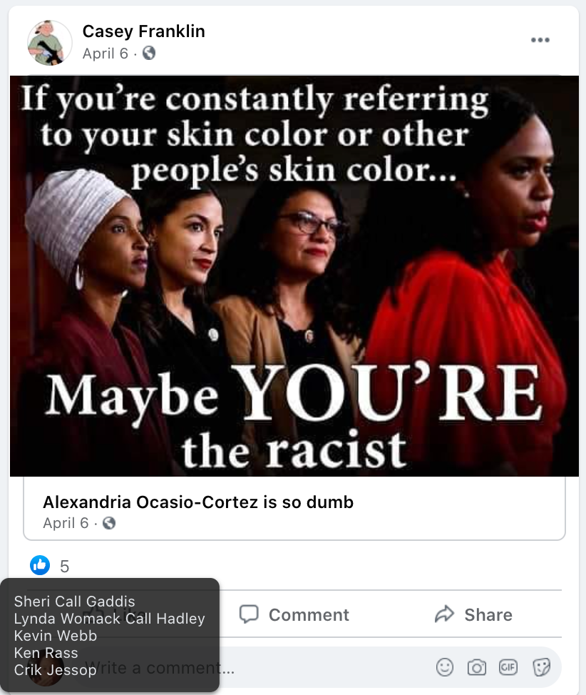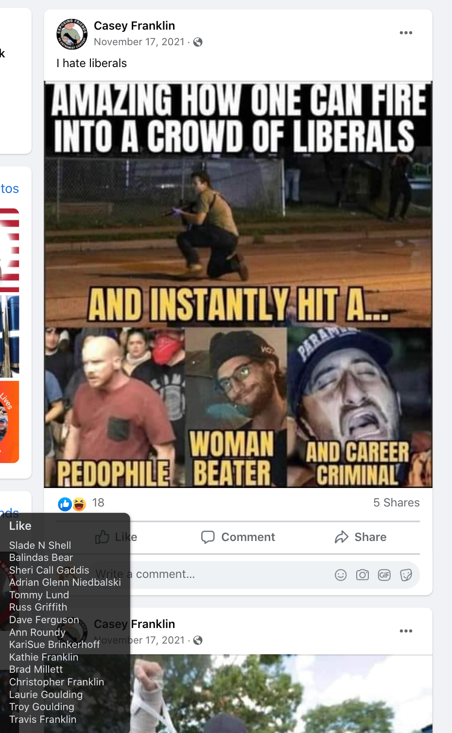 Casey glorifies violence (Rittenhouse, My Pillow guy killing Biden, death to Clinton, AOC), , frequently posts Michelle Obama’s gender, pending war with bloodshed & fear and anti-Black Lives Matter.