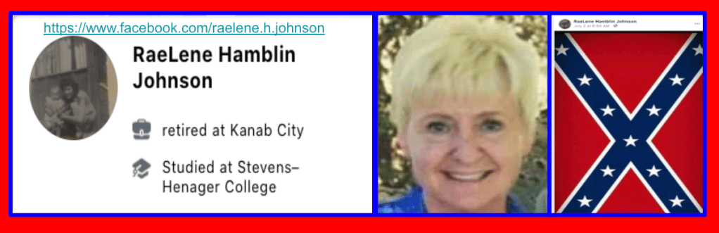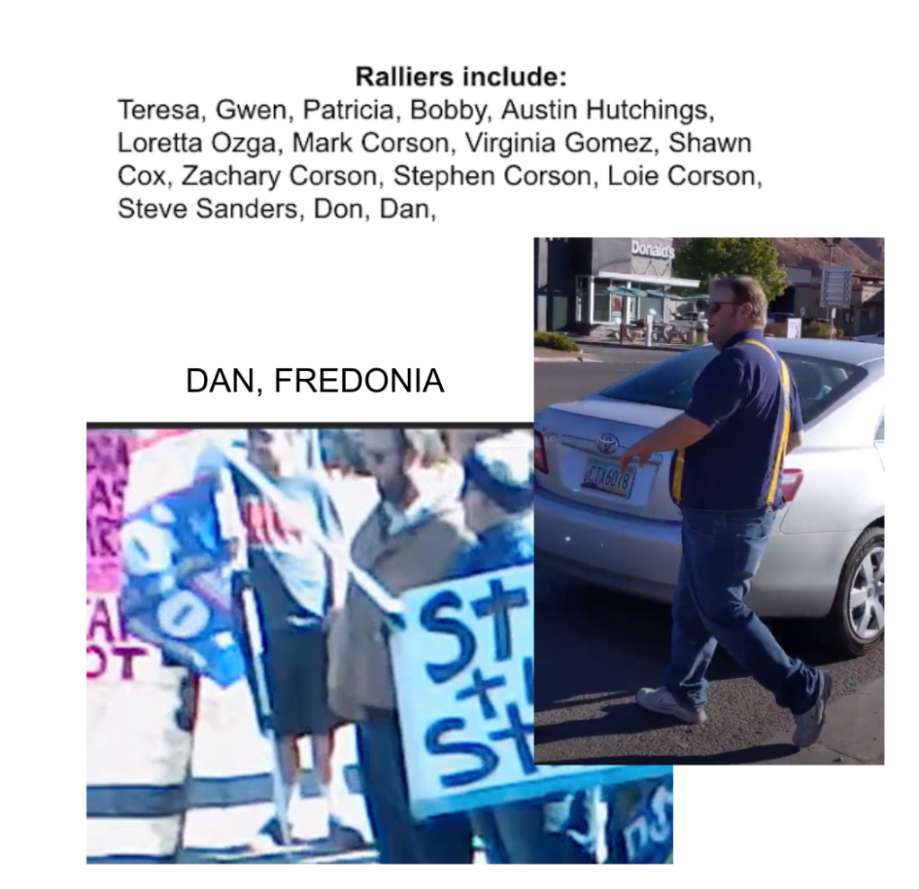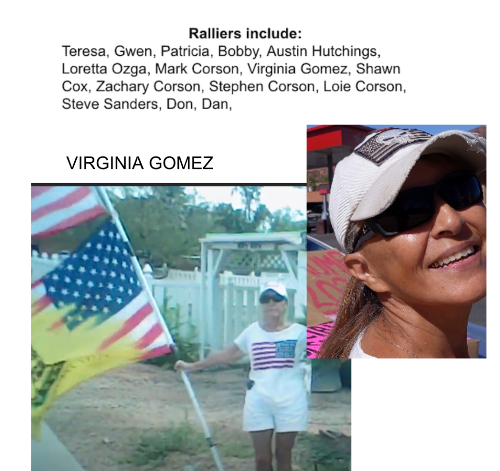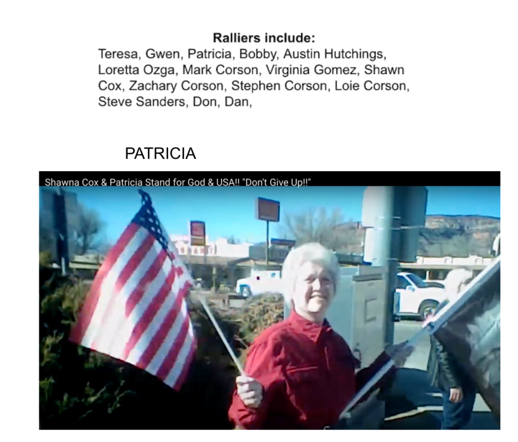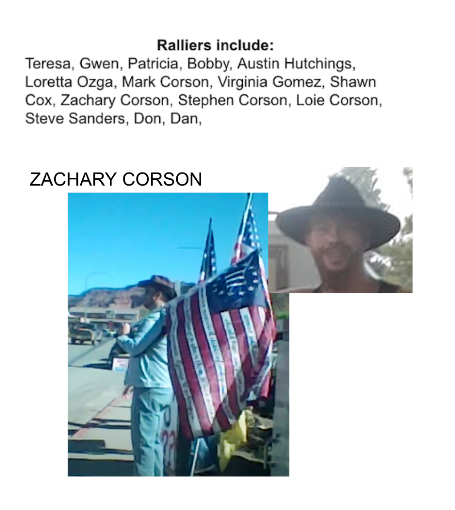 The organizers (The Corsons, Shawna Cox, Colleen Huston & Steve Sanders) are included in section 3/4 following this section. The participants (Teresa, Gwen, Patricia, Bobby, Austin, Loretta, Virginia, Don & Dan) are in photos in a slideshow just below. Of the participants, only Loretta Ozga was included in a previous post for Kanab Patriot’s defense of her behavior harassing the owner of Kanab Natural Market for her “I Can’t Breathe” sign following the murder of George Floyd.