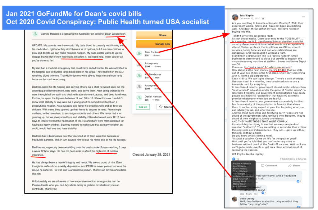 Just a little covid & socialism hypocrisy from Wessendorf & Esplin. In October 2020 they claim conspiracy, that public health safety transformed USA socialist in 4 months and that the $2400 stimulus was stolen hush money. In January 2021, Wessendorf gets Covid and his family requests financial help because he was never able to afford medical insurance.