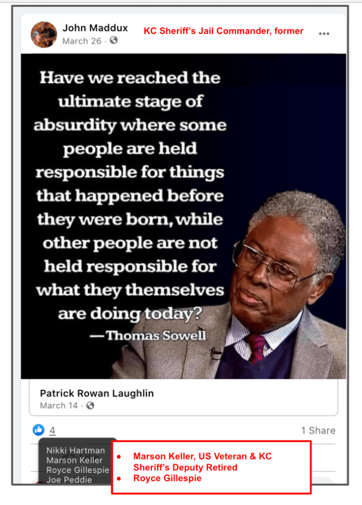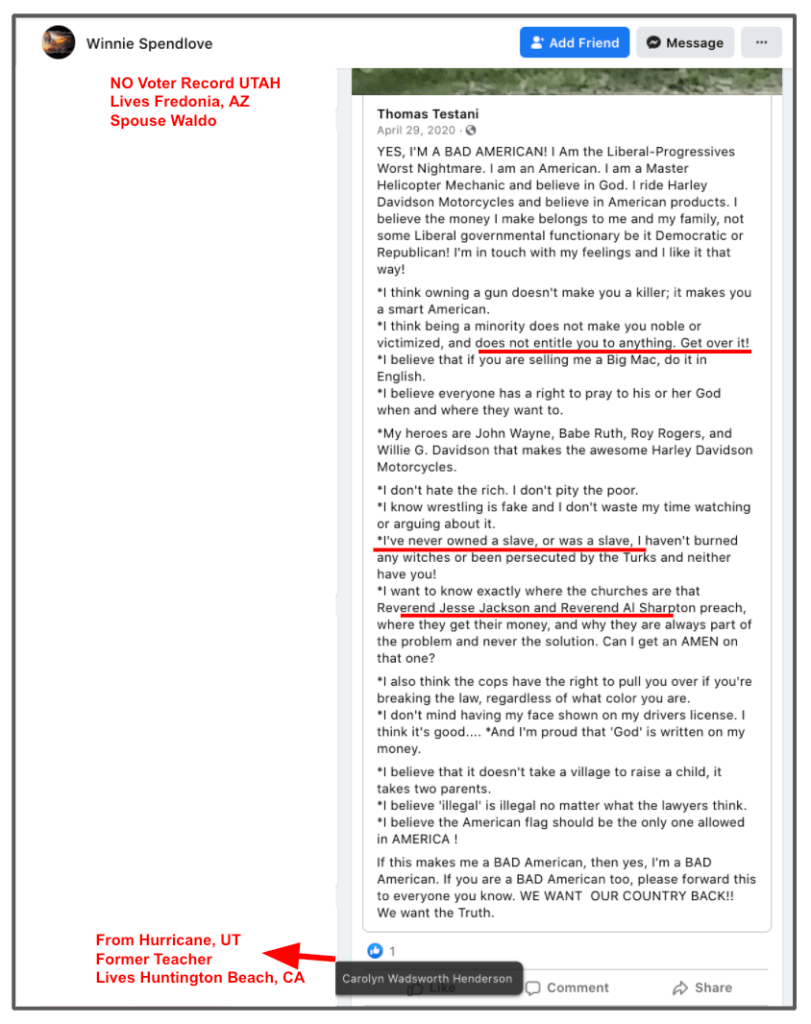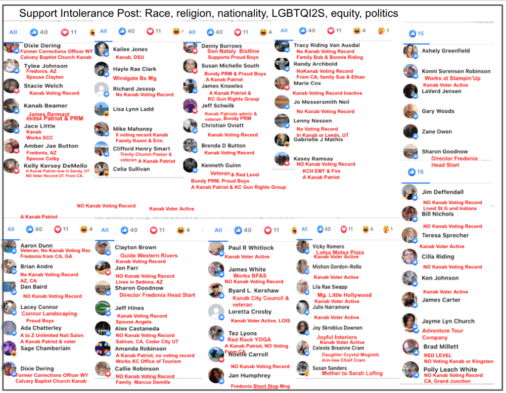 Red font in the list below indicates Meet Your Neighbors: Red Level. Spouse names are in parenthesis if there is no evidence of extremism/bigotry. The spouse name which appears first is the subject of this post unless couples share one Facebook page. This section was updated 02/19/2022.