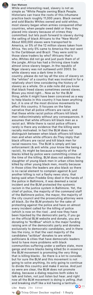 “Blaming white people for enslaving black people is not only wrong and immoral but it also instills racism in people and makse them thing that this persons ancestors enslaved my ancestors and that is why I am in this situation”