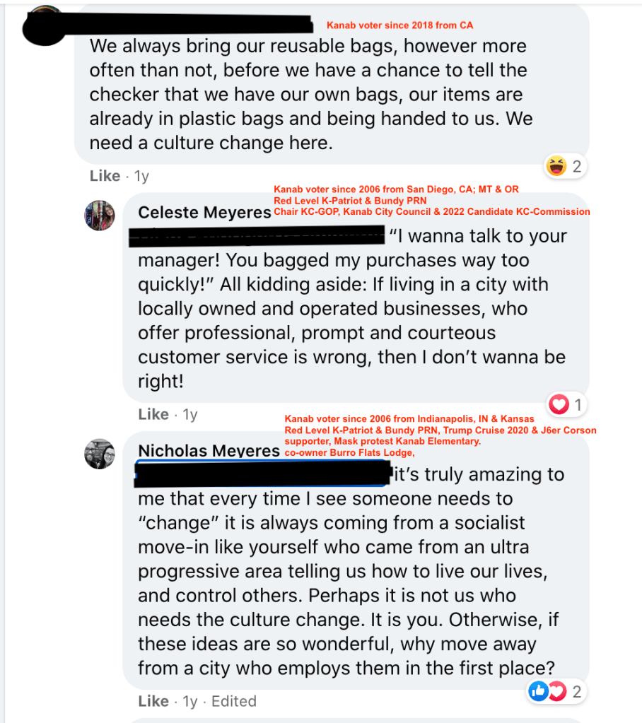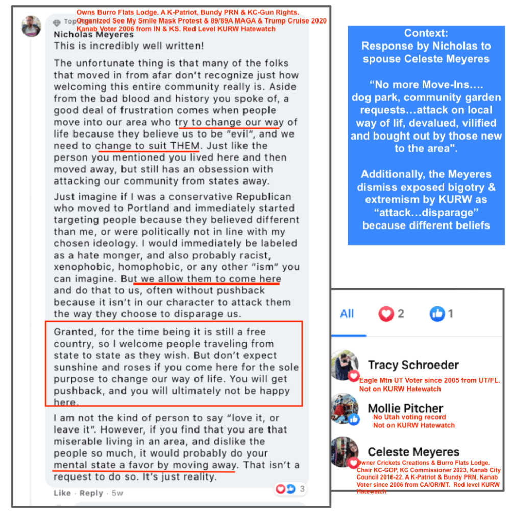 When a resident shared their perspective as invited by the post in local group Kanab Unclassifieds, the elected official & local business owner Celeste & Nicholas Meyeres double team to berate and demean. Nicholas blames any desire for change on socialist move-ins. Celeste berates the resident after posting to share perspectives. All of them moved to Kanab from somewhere else: Celeste in 2006 from San Diego, CA, Beaverton, OR and Red Lodge, MT. Nicholas in 2006 from Indianapolis & Attica, Indiana and Hutchison, Kansas.