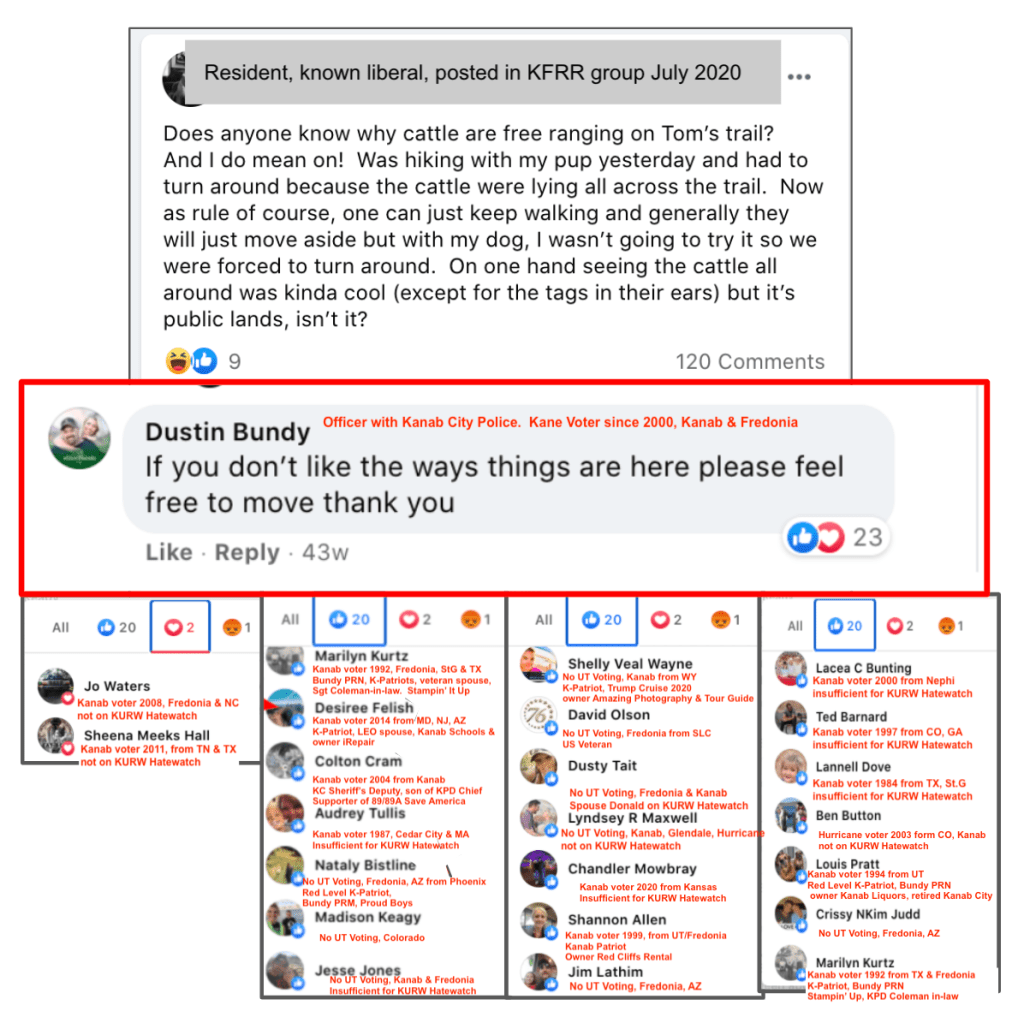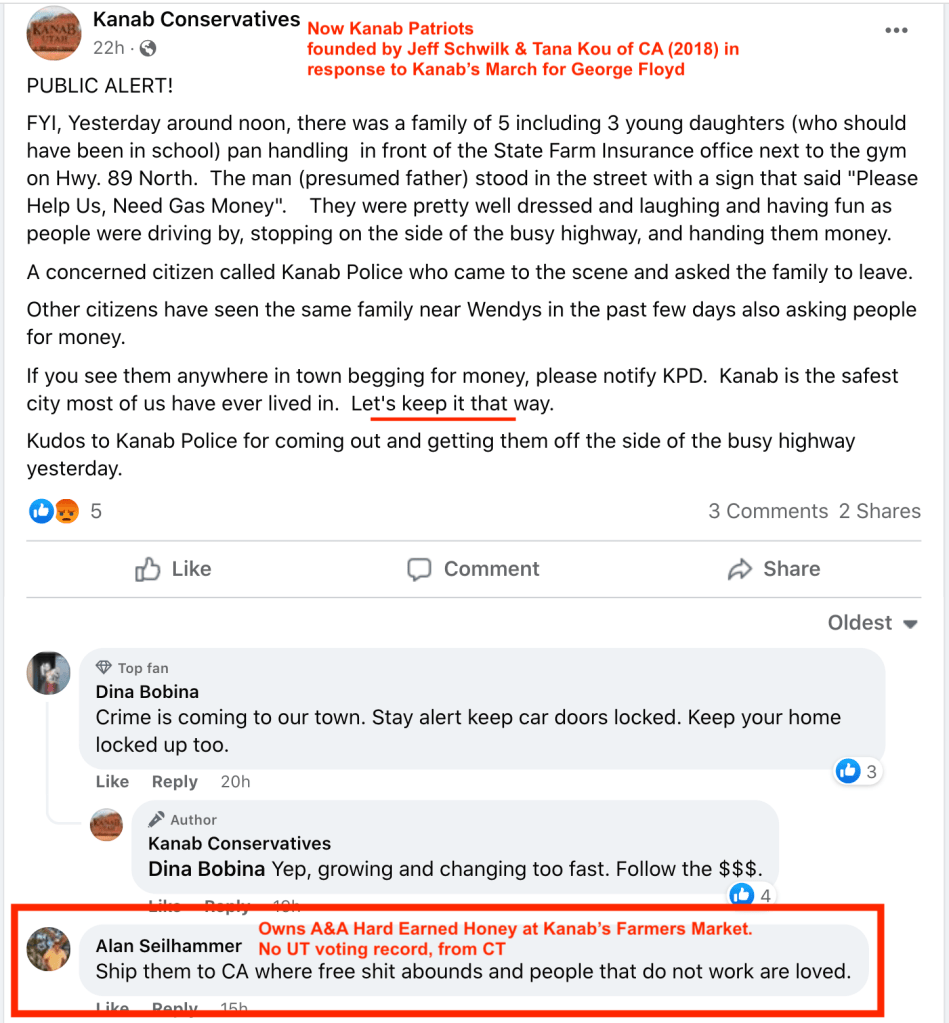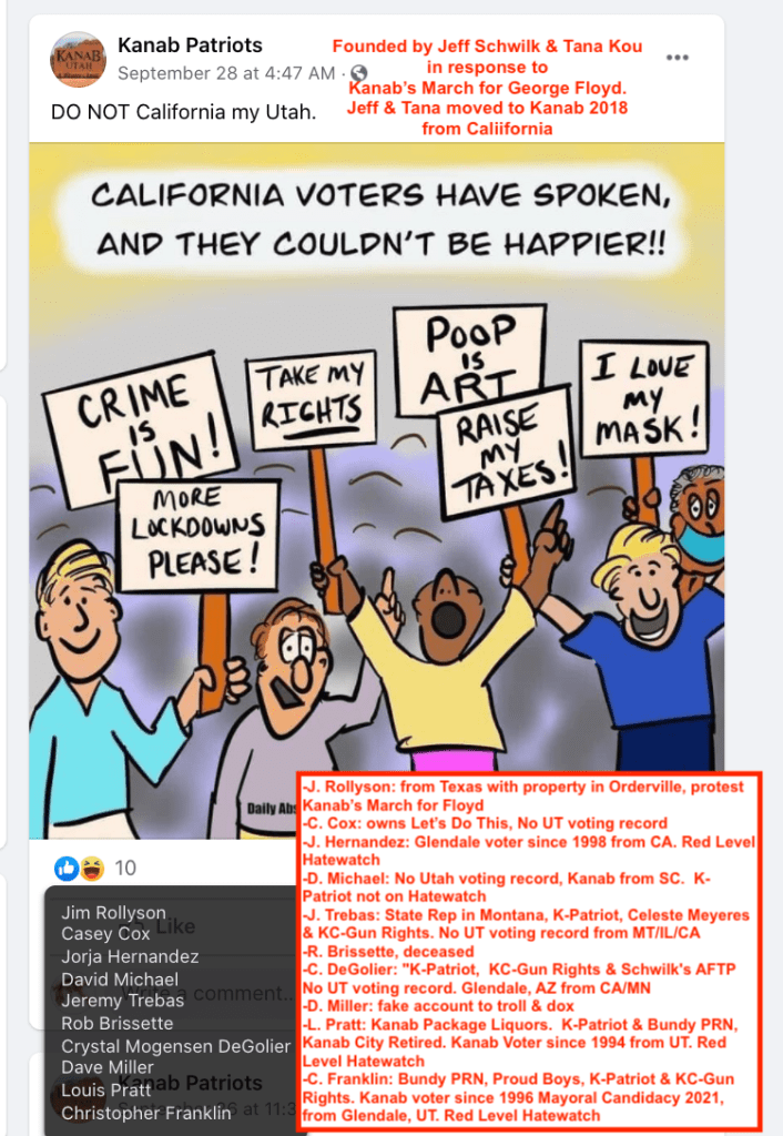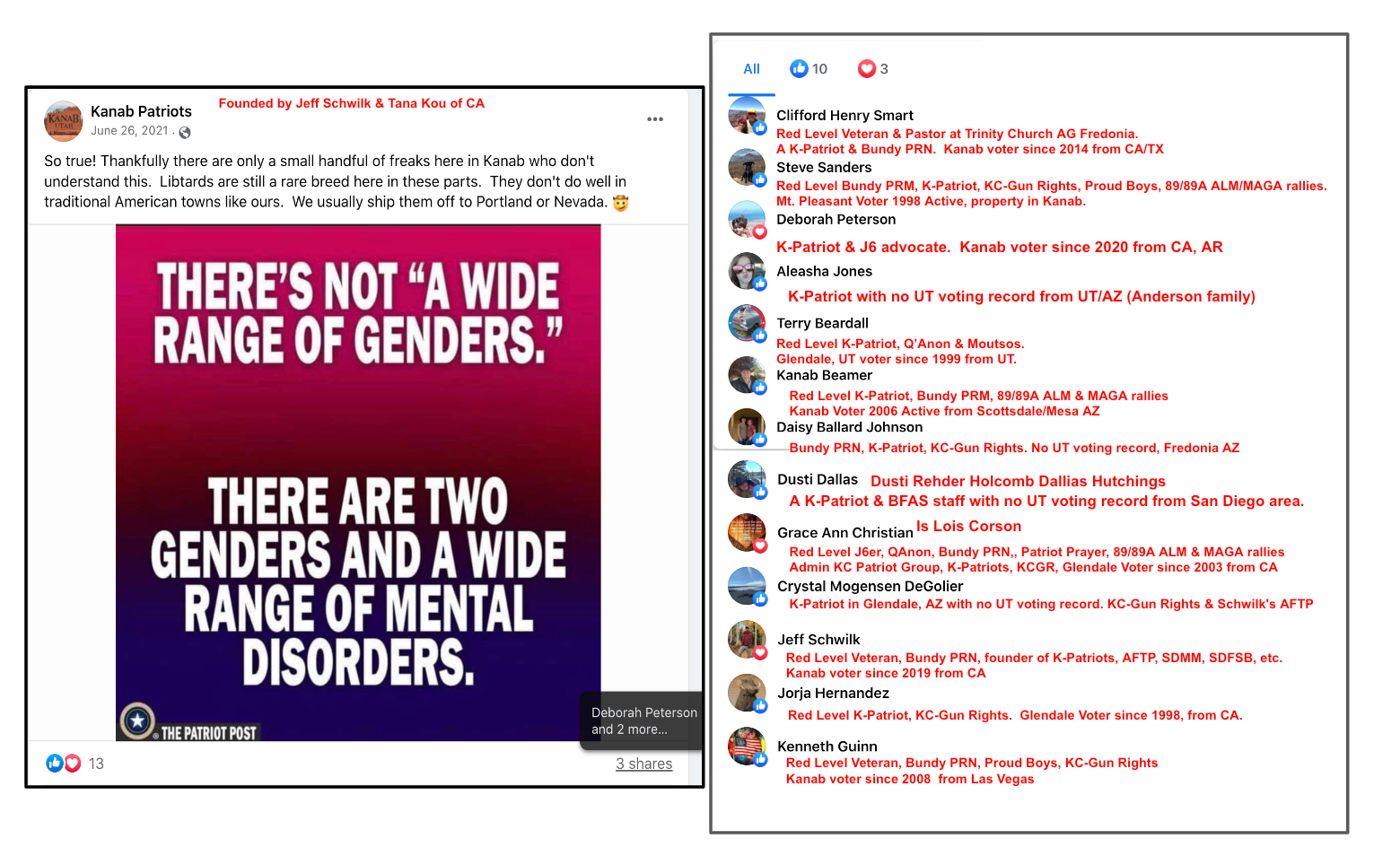 The Facebook page “Kanab Patriots” branched from Schwilk & Kou’s first page in Kanab “Kanabians for Slow, Sensible Growth”. See more of the history of these pages, the radicalization of the followers and the history of the founders at KURW Post “Kanab Patriots” Recruits and Radicalizes Facebook Extremists