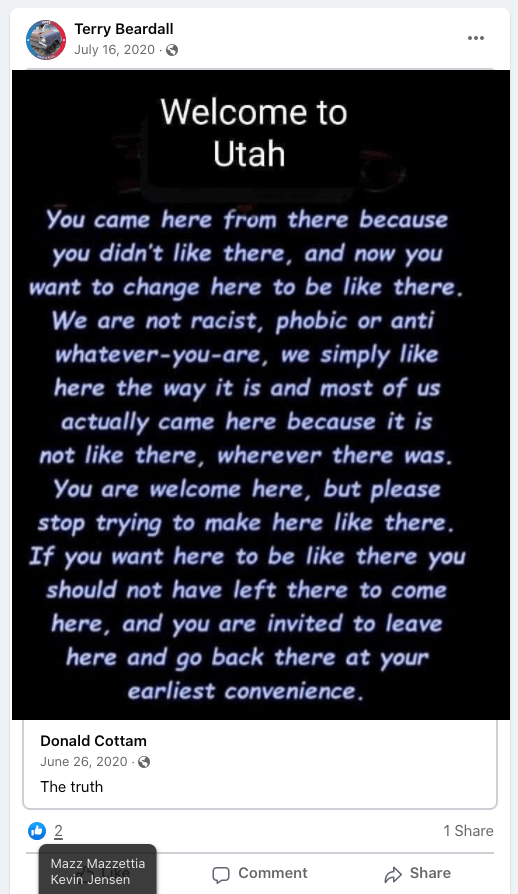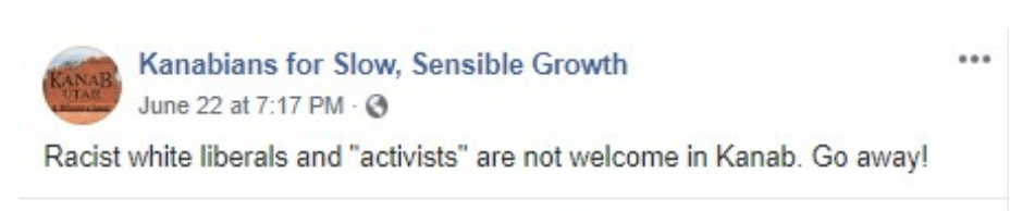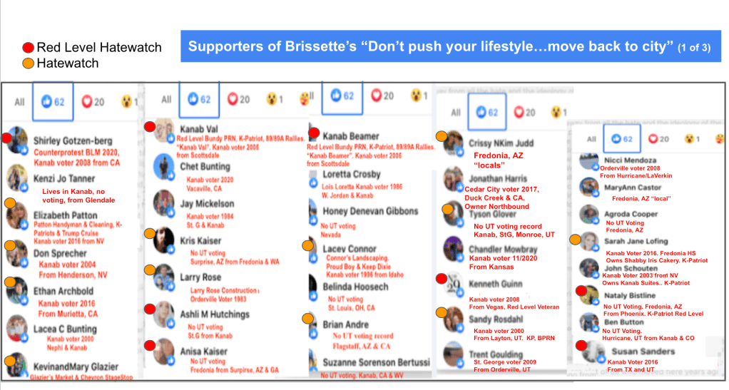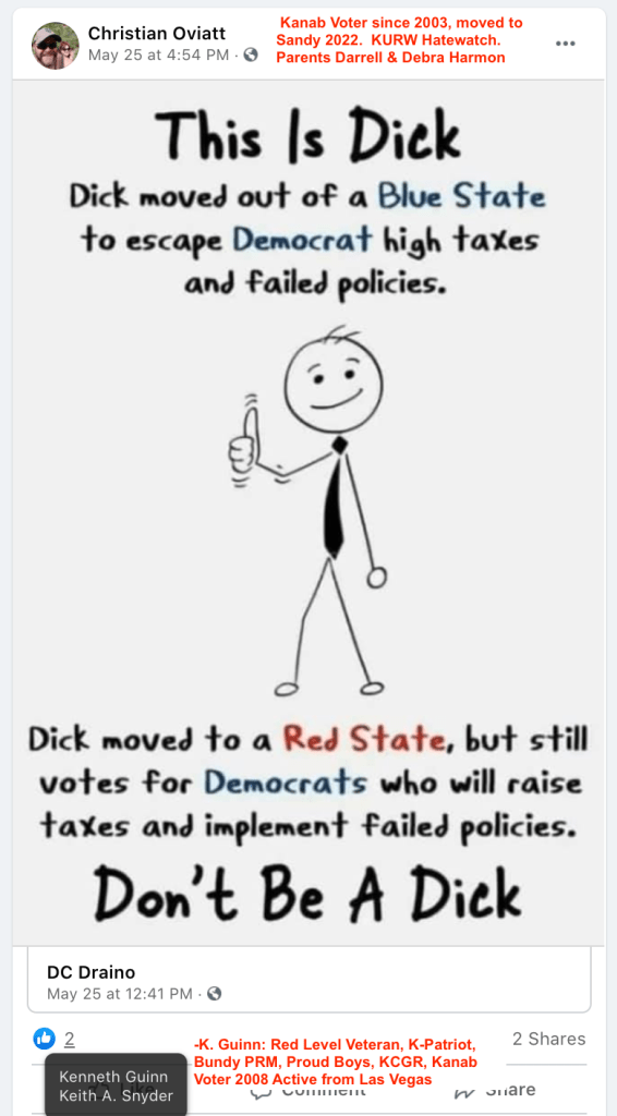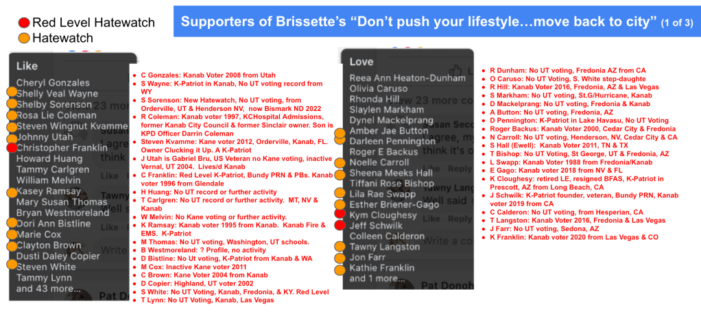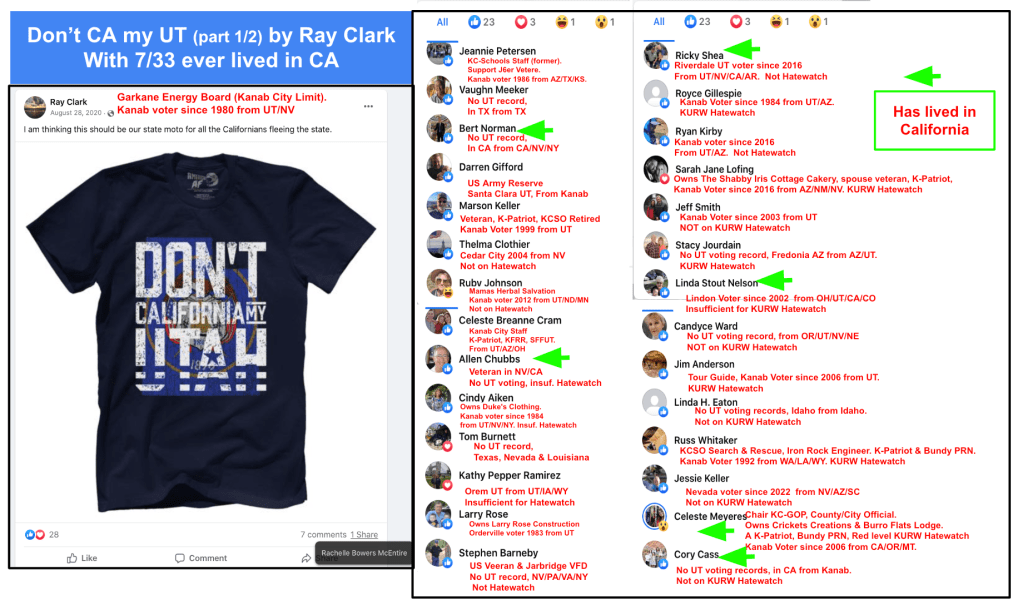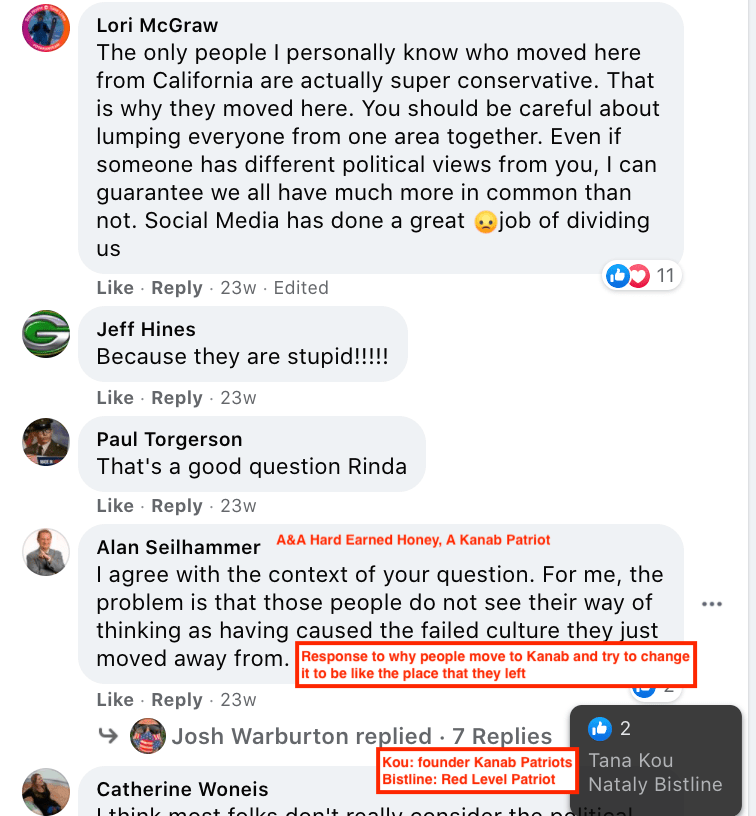 (updated 07/21/23, add Mayor Purvis). This post is a special request to expose the bigotry of “transplants, move-ins, and those not like themselves.” The residents of Kane County Utah who do post such bigotry, typically use “love it or leave” or “move back to where you came from” and “Don’t California my Utah”.