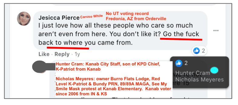 Two locals, Tyson Glover & MaryAnn Castor, support Castaneda’s comment. Neither have Utah voting records, Tyson supports Kanab Patriots & Bundy’s People’s Rights Network.