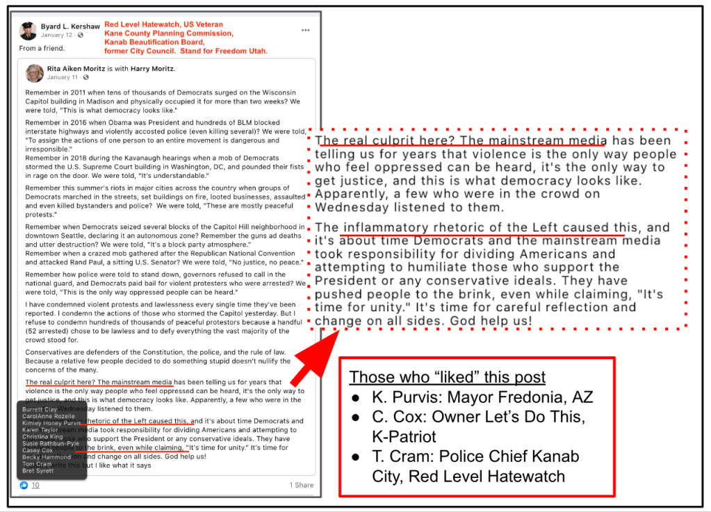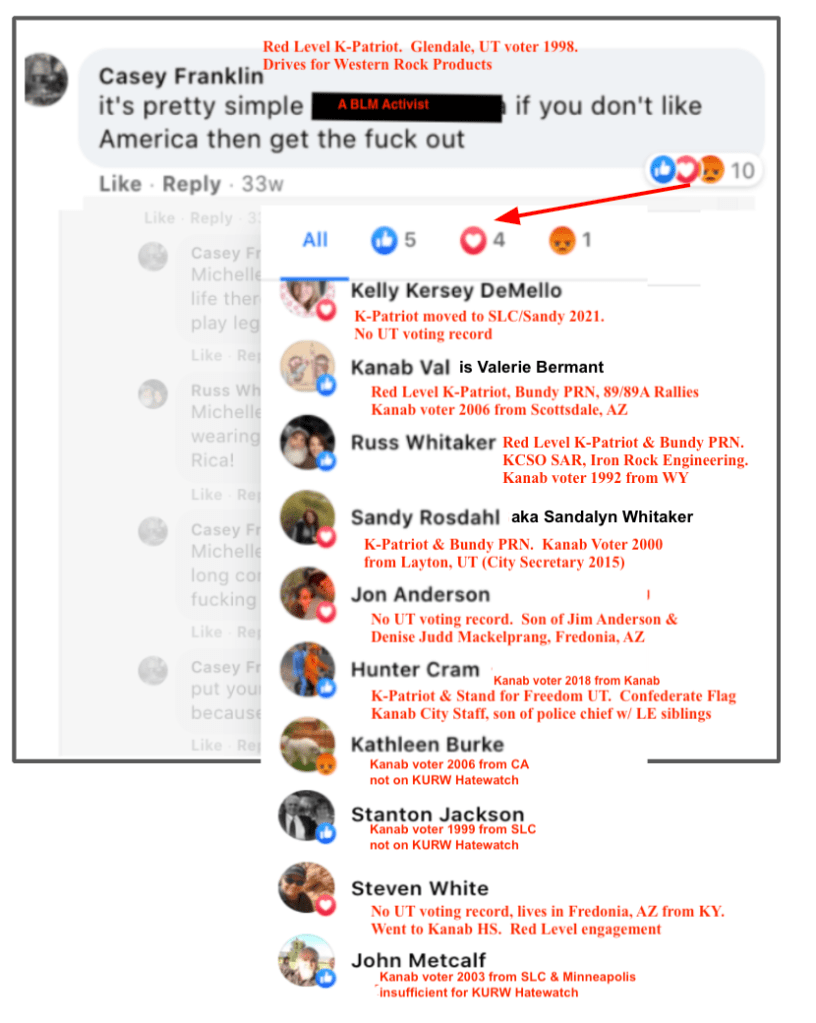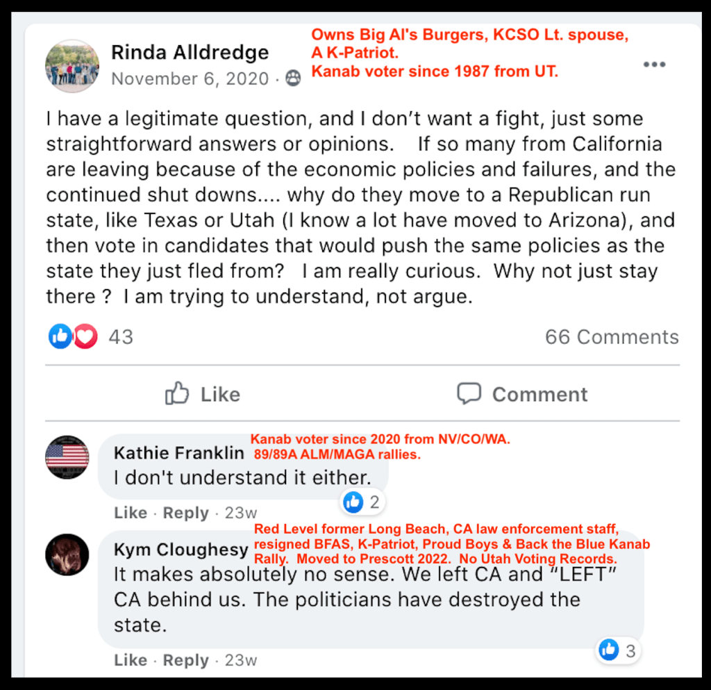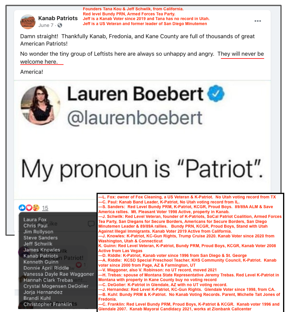 | Alicia Riggins Cram: owner of Alicia Cram Photography, & Kanab Schools, spouse of KCSO Deputy Colton Cram. A K-Patriot with No UT voting record, previous residences in St. George & Vernal, UT; Camas, WA. Bobbette Crosby Lewis of “Bobbi N Jeff Lewis”: owner of Kanab Laundromat & Carwash and of Lewis Construction. Sibling & supporter of J6er Dave Crosby, Red Level K-Patriot. Kanab voter since 2016, previously Kennewick, WA & Idaho Falls. Jeffrey Moss Lewis of “Bobbi N Jeff Lewis”: owner of Kanab Laundromat & Carwash and of Lewis Construction. Supporter & in-law of J6er Dave Crosby, Red Level K-Patriot. Washington, UT voter 2003 (Inactive, no Kanab), previously Miami, FL. John Schouten: co-owner Kanab Suites w/ spouse Crystal Aiken. A Kanab Patriot & Kane voter since 2003 from Las Vegas/Henderson, Nevada. Also supported Rob Brissette’s “Just Leave” post featured in first section. Laura Fox: owner Fox Cleaning, US Veteran, K-Patriot & KC Gun Rights Group. No Utah Voting record, from TX. Chris Paul: The Chris Paul Band in Kanab since 2021. A K-Patriot with No Utah voting record, from Illinois. | Kenneth Guinn: US Veteran, Red Level K-Patriot, Bundy PRN & Proud Boy. Kane voter since 2008 from Las Vegas, NV Laura Fox: owner Fox Cleaning, US Veteran, K-Patriot & KC Gun Rights Group. No Utah Voting record, from TX. April Riddle: Kane County School Teacher & Community Council. Kanab voter since 2000 from Page, AZ & UT. Jeff Schwilk: Red Level Veteran, founder of K-Patriots, SoCal Patriot Coalition, Armed Forces Tea Party, San Diegans for Secure Borders, Americans for Secure Borders, San Diego Minutemen Leader. Member/supporter: Bundy PRM, KCGR, Proud Boys, Stand with Utah Against Illegal Immigrants. Kanab Voter since 2019 from California. Hannah Trebas: Red Level K-Patriot in Montana, spouse State Rep of MT. No Utah voting records, Kane County property owner |