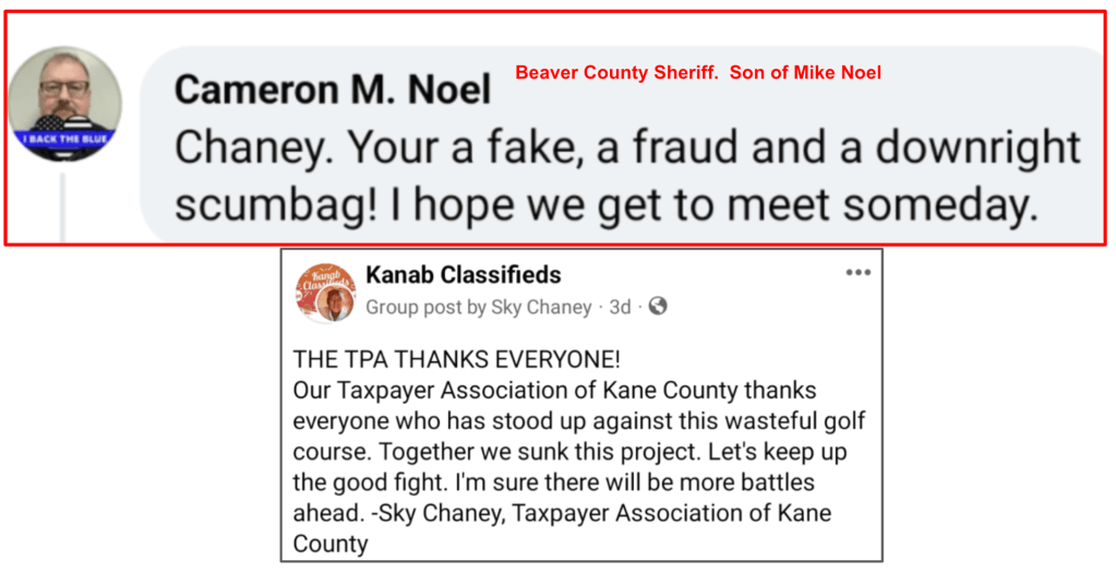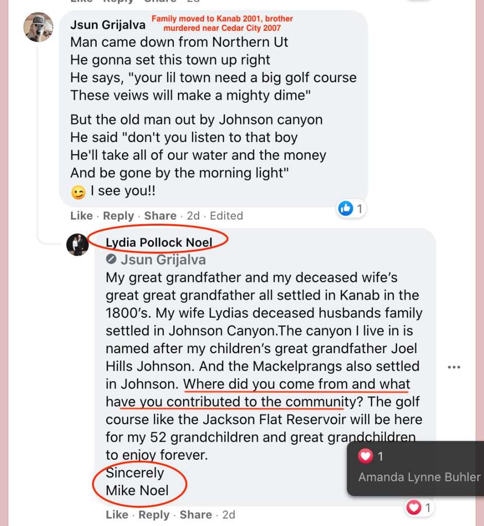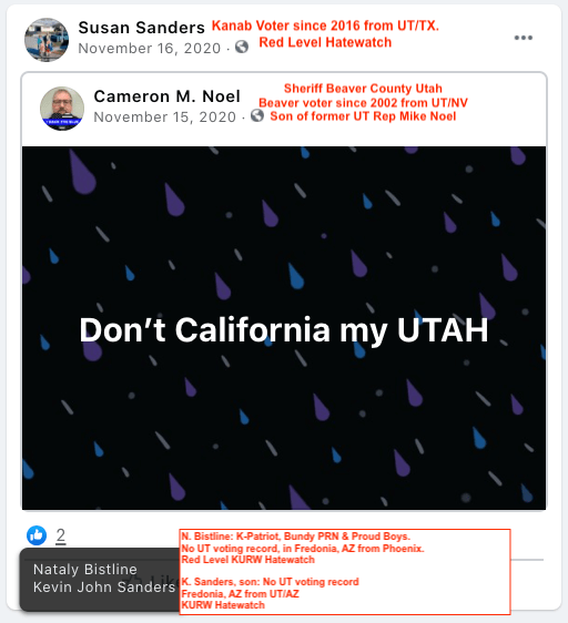 Mike Noel, former UT State Representative, a Red Level Hatewatch Neighbor and current Director of Kane County Water District, used these tactics in response to criticism from 20 year resident Jsun Grivalva over criticism of a proposed golf course. “Where did you come from & what have you contributed?” Noel has been a Kane County voter since 1980, born in Ogden, Utah and is a graduate of UC Berkeley, University of South Dakota & Utah State. Mike often uses Lydia’s, his spouse since 2017, Facebook post to argue with residents in local FB groups. Cameron Noel, Mike’s son & Sheriff in Beaver County, UT shares this bigotry of move-ins as seen in his “Don’t CA my UT” post in a following section.